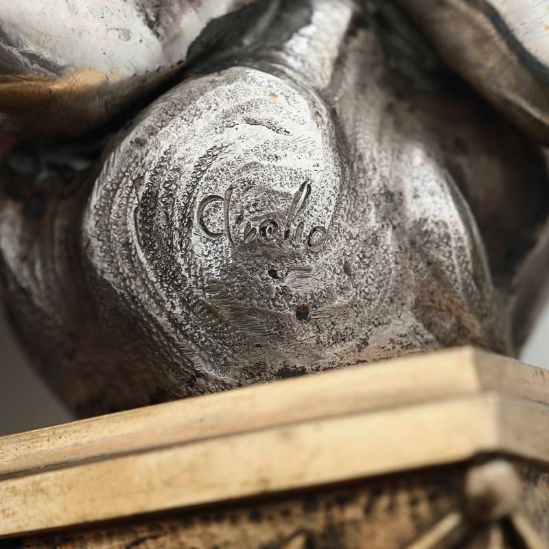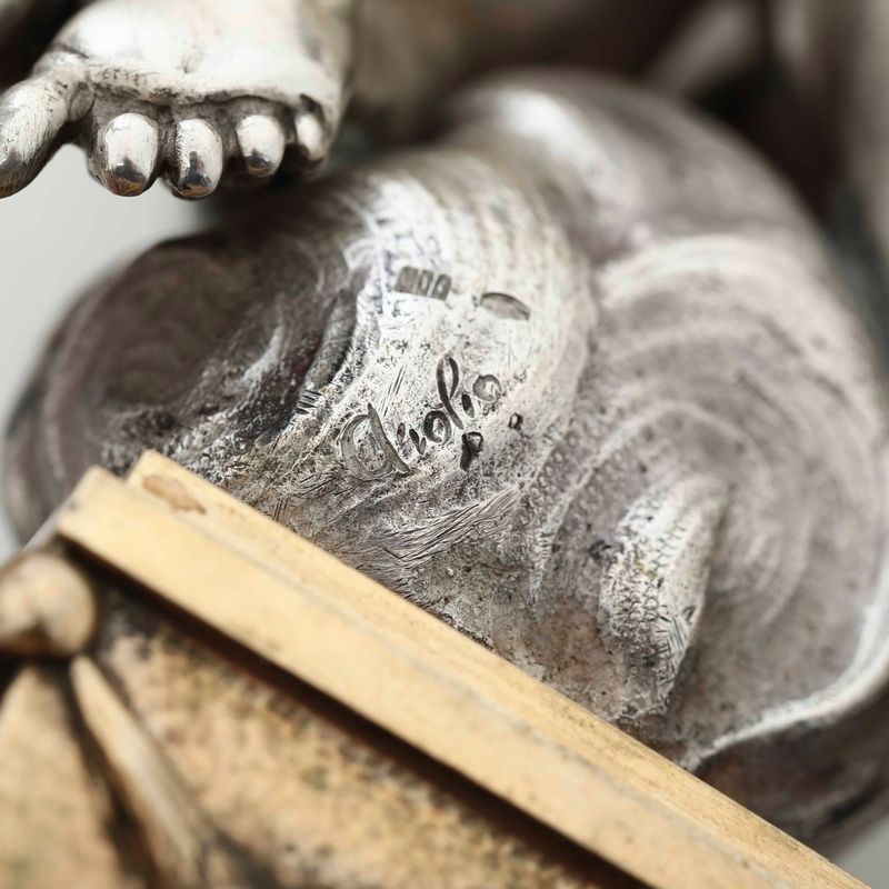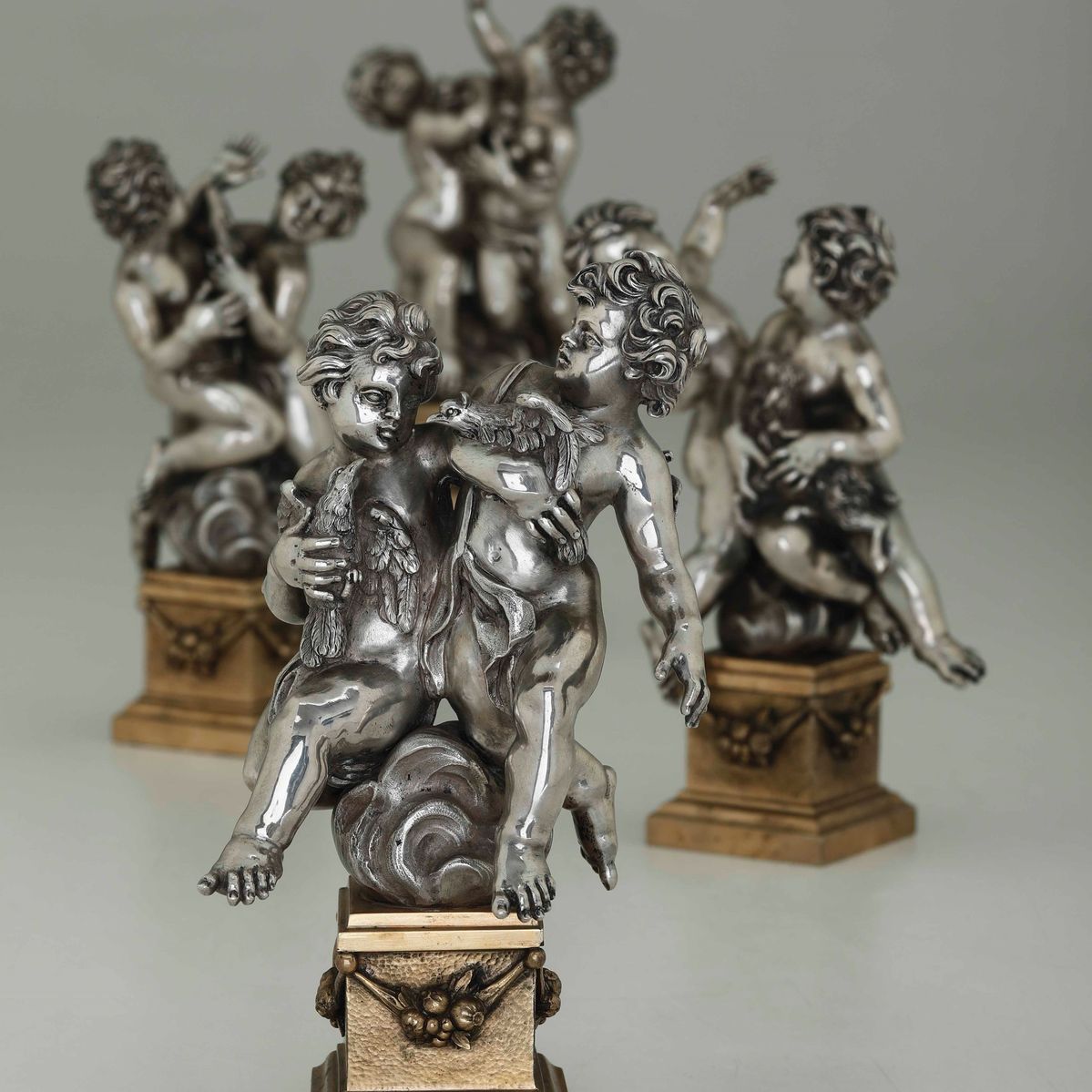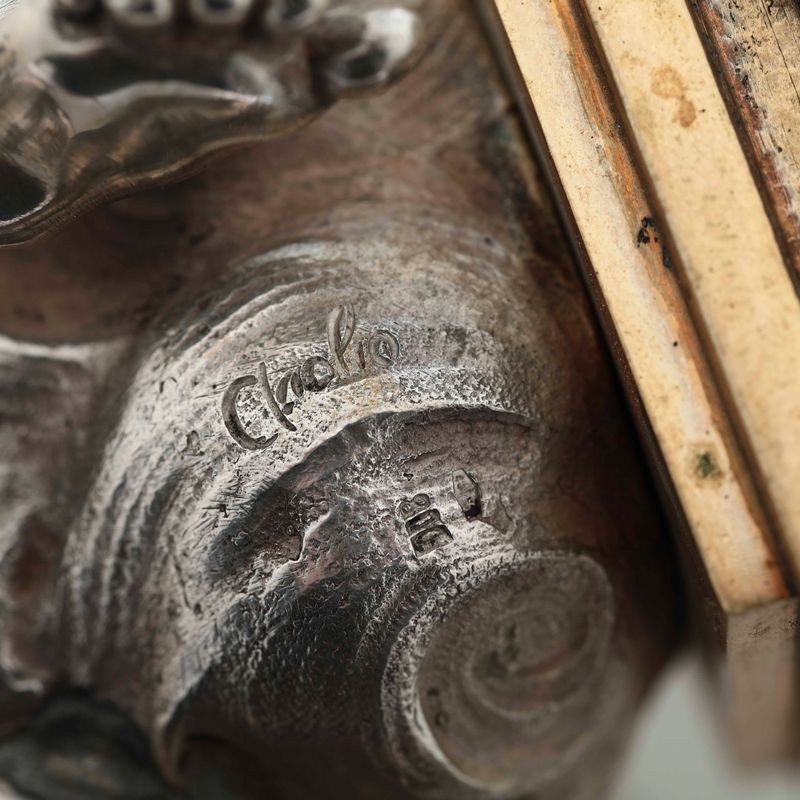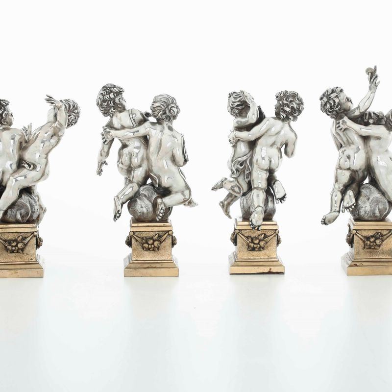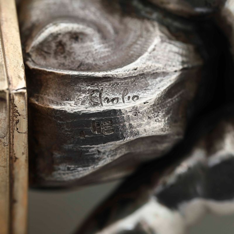 Marks with fasces in use from 1935 to 1945. Silversmith Luigi Avolio. H from 18 to 22 cm. Molten and chiselled silver on molten and gilt bronze bases