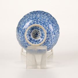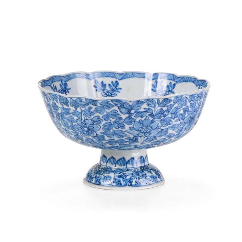 Alzatina in porcellana bianca e blu a decori floreali, Cina, Dinastia Qing, epoca Kangxi (1662-1722)