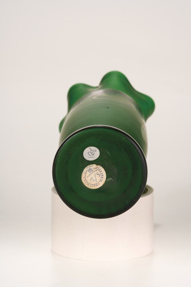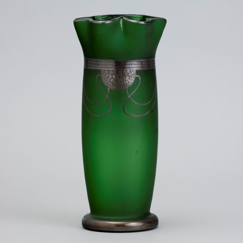 Vaso in vetro soffiato verde con bocca polilobata e decoro in argento.
