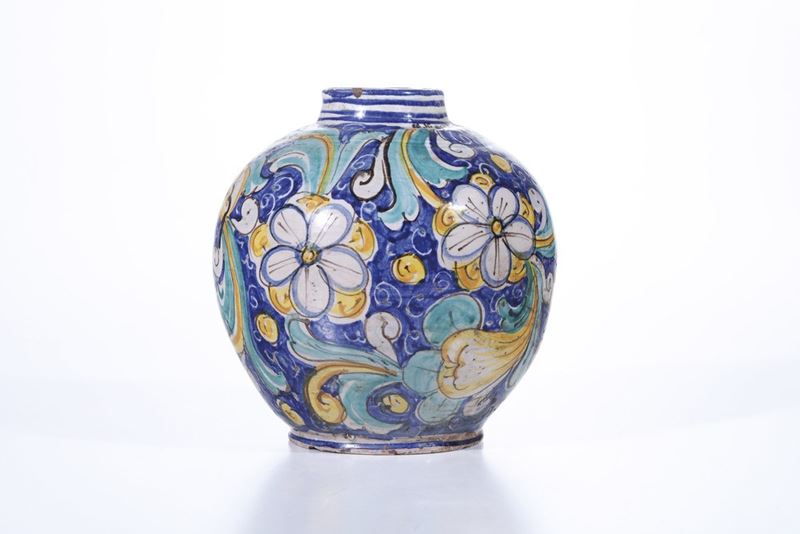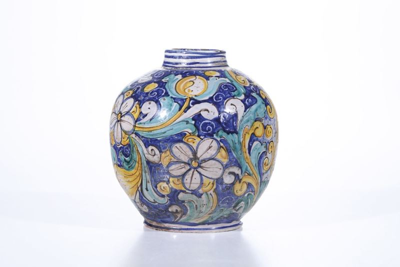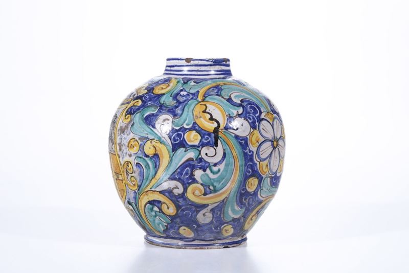 Maiolica policroma a gran fuoco. Marca: "CA.MI Caltagirone" al piede del collo. Altezza cm 24. Conservazione: piccoli salti di smalto ai bordi
