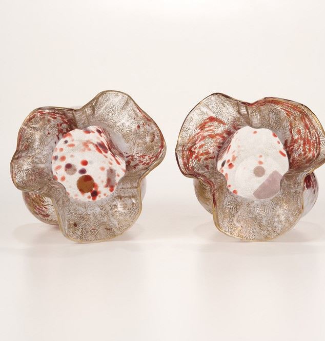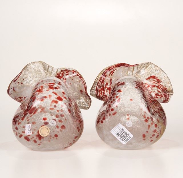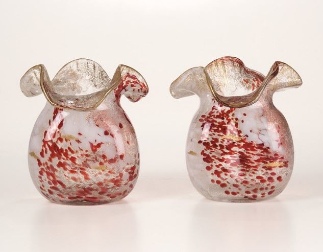 Coppia di vasi a tulipano in vetro maculato lattimo e rosso con decoro floreale in foglia oro.