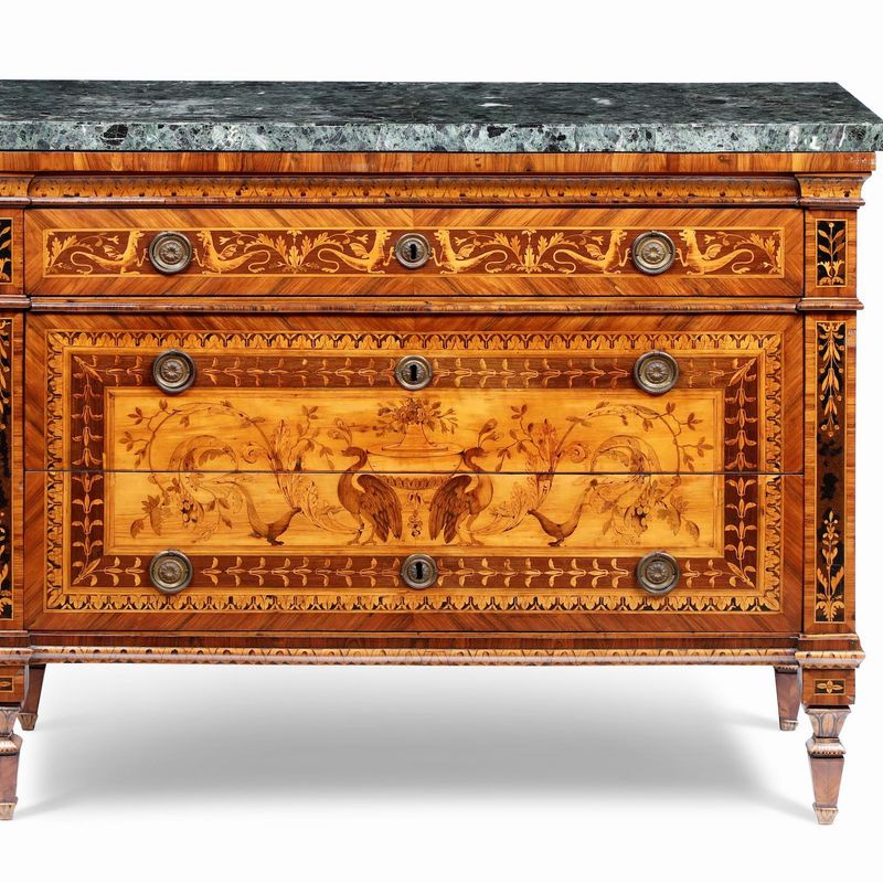Cassettone finemente lastronato ed intarsiato in varie essenze pregiate nei modi del Maggiolini. Lombardia, fine XVIII se [..]