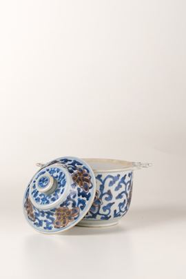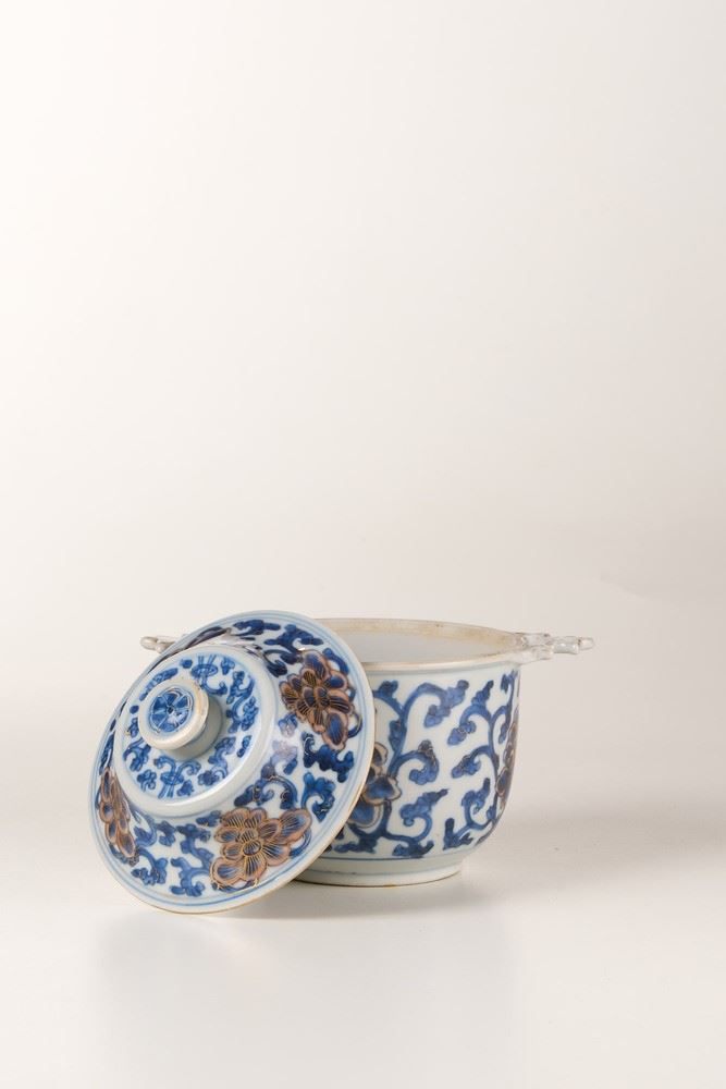 Ciotola con coperchio in porcellana bianca e blu con decori floreali lumeggiati in color oro, Cina, Dinastia Qing, epoca [..]