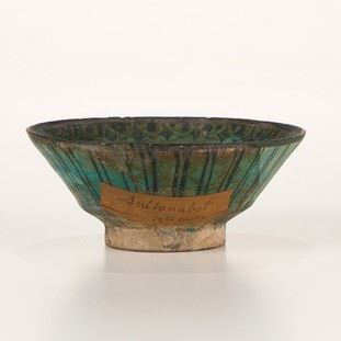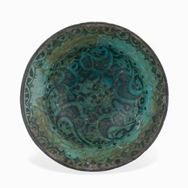 Ceramica artificiale (“fritta”). Dimensioni: altezza cm 6,8 circa; diametro cm 16 circa. Conservazione: rotta in più frammenti e ricomposta in restauro. Provenienza: collezione Luigi Laura, Ospedaletti, come da etichetta cartacea