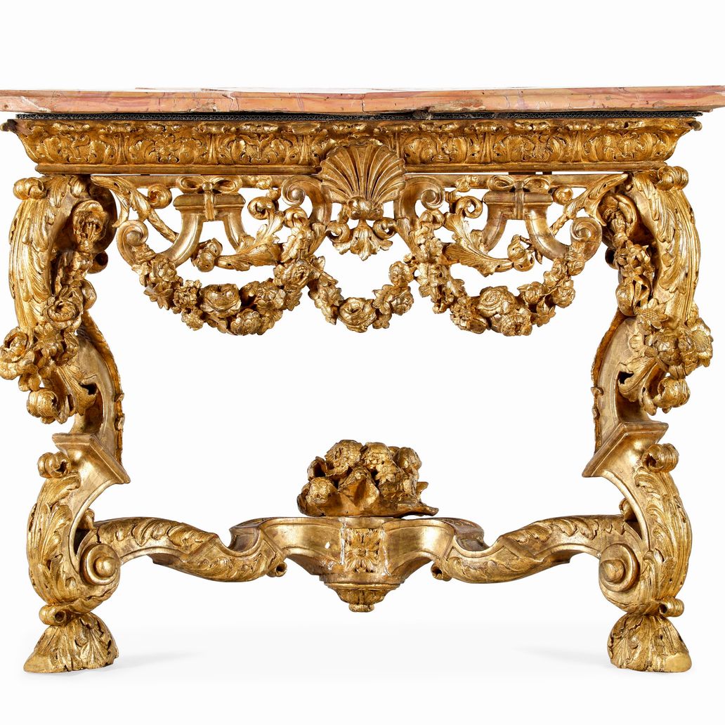 gambe a volute con festoni fioriti riunite da traversa, piano in marmo breccia pernice rossa (elementi non coevi, difetti, rotture)