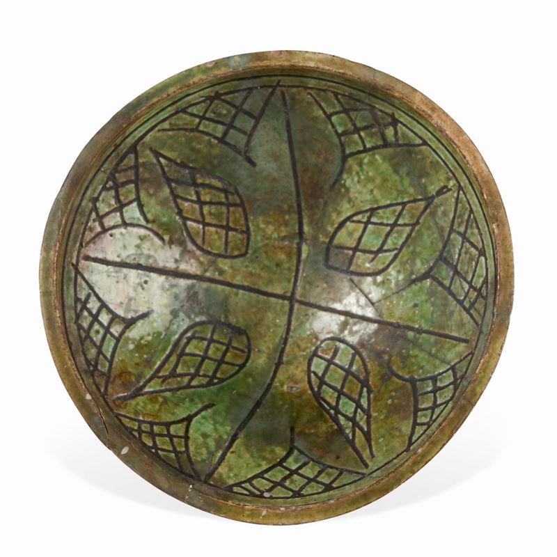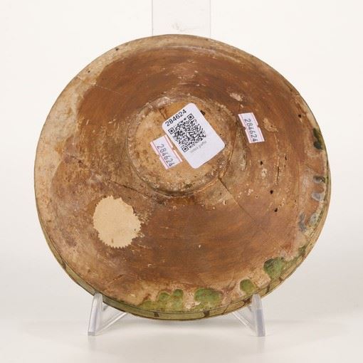 Ceramica graffita e invetriata. Dimensioni: altezza cm 6,3 circa; diametro cm 15,3 circa. Conservazione: rotta in più frammenti e ricomposta in restauro. Provenienza: collezione Luigi Laura, Ospedaletti, come da etichetta cartacea