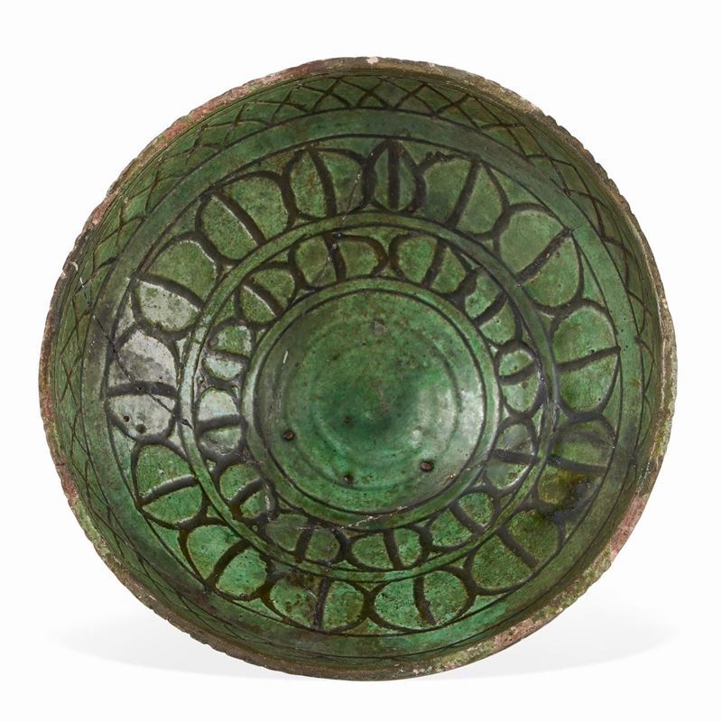 Terracotta graffita invetriata. Dimensioni: altezza cm 8,3 circa; diametro cm 18,6 circa. Conservazione: rotta in 5 frammenti e ricomposta in restauro