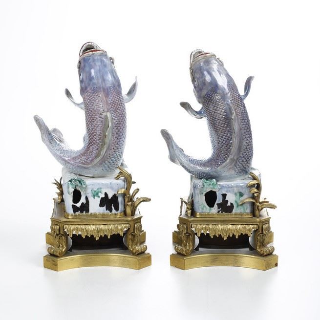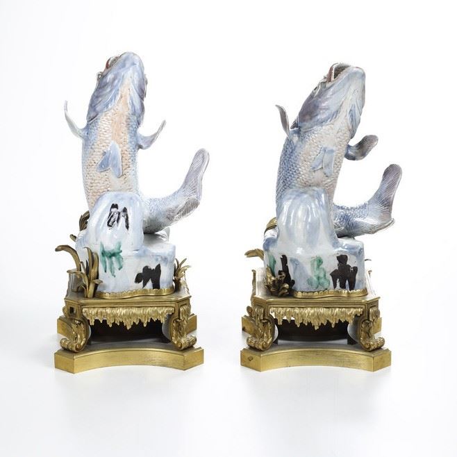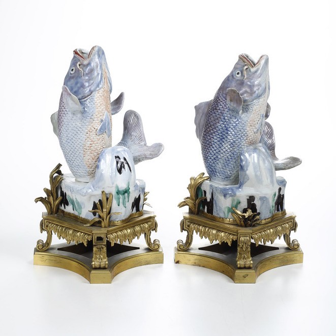 Coppia di carpe in porcellana dipinta in underglaze blu. Giappone, epoca Edo (1600-1868), primo quarto XIX secolo