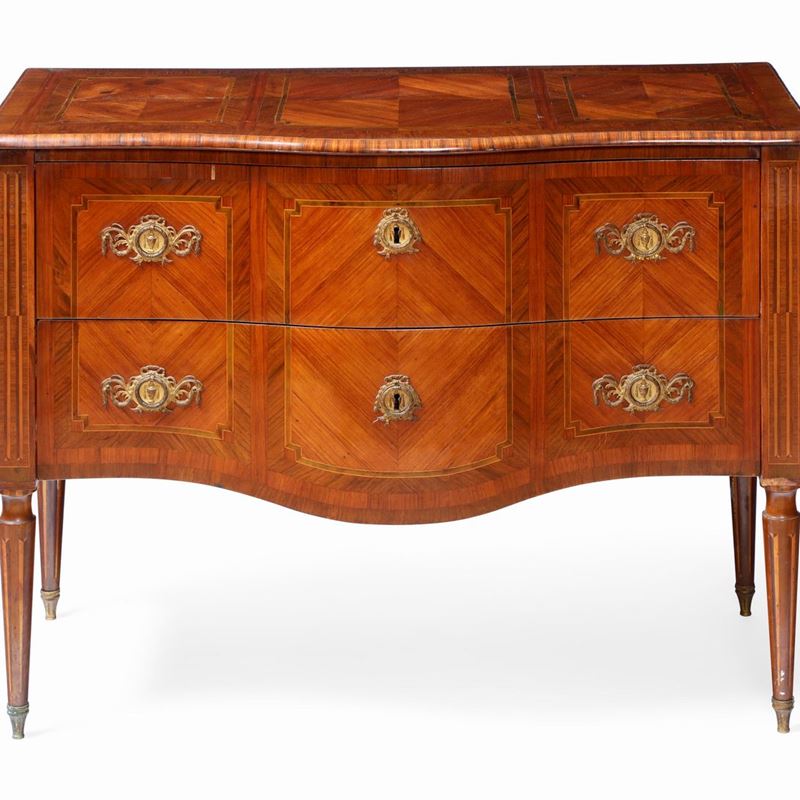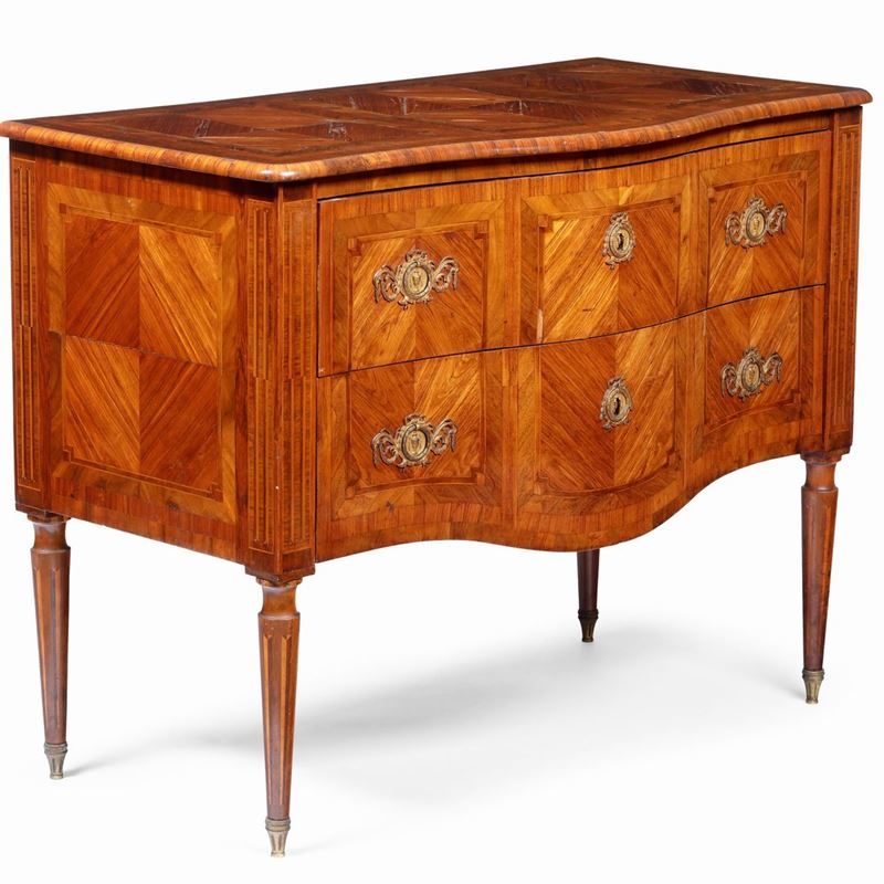 Coppia di commode in legno lastronato ed intarsiato. Francia XVIII secolo