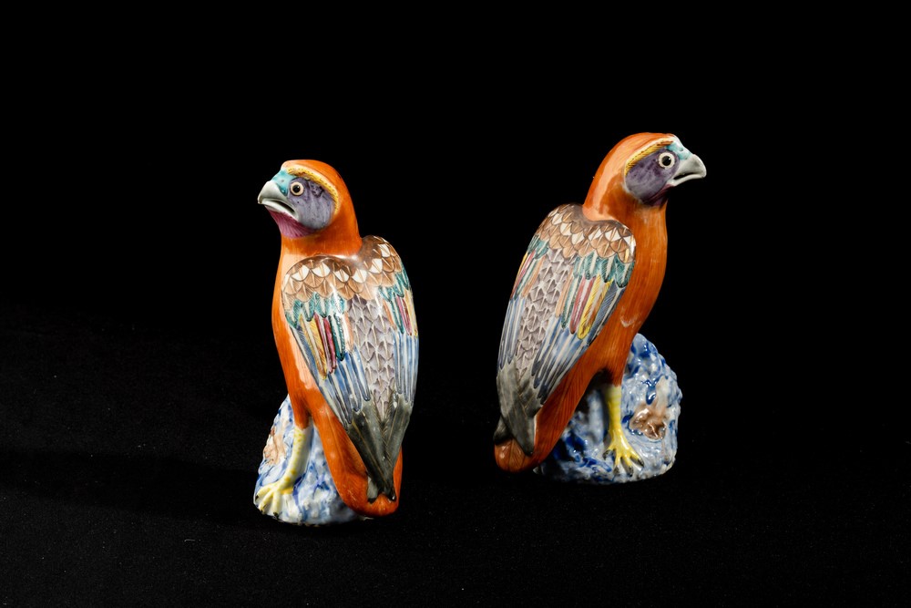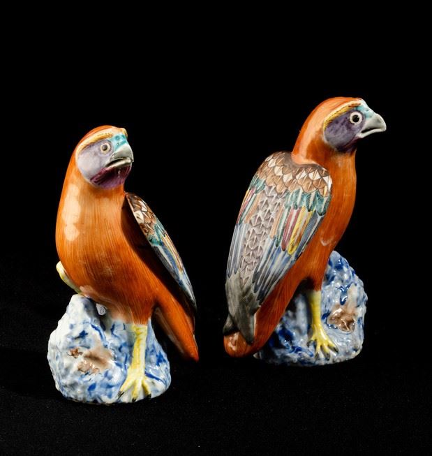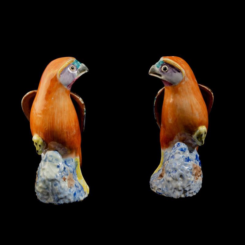 Coppia di falchi in porcellana Famiglia Rosa decorati con smalti e oro, Cina, Dinastia Qing, epoca Qianlong (1736-1795)