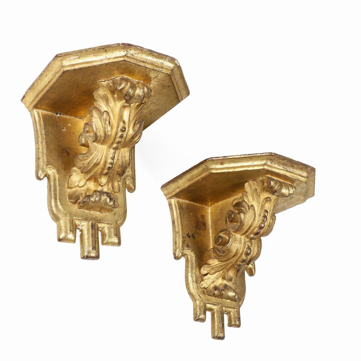 Coppia di mensoline in legno intagliato e dorato. XIX-XX secolo