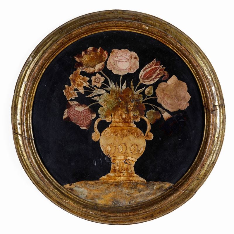 Coppia di nature morte, scagliola policroma e cornici in legno modanato e dorato. Arte italiana del XVIII secolo
