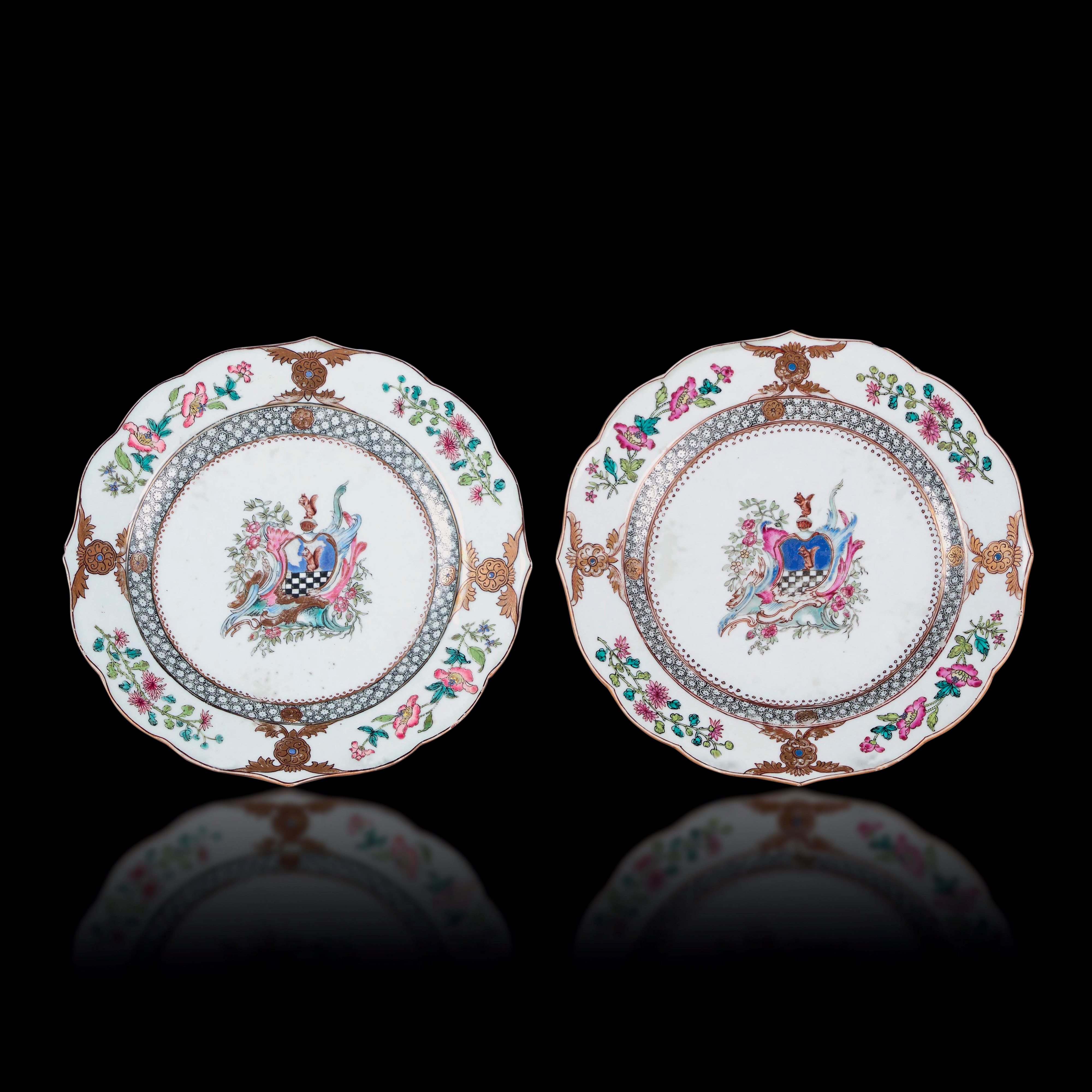 Coppia di piatti in porcellana Famiglia Rosa a decorazione floreale con stemma al centro del cavetto, Cina, Dinastia Qing, epoca Qianlong (1736-1796)
