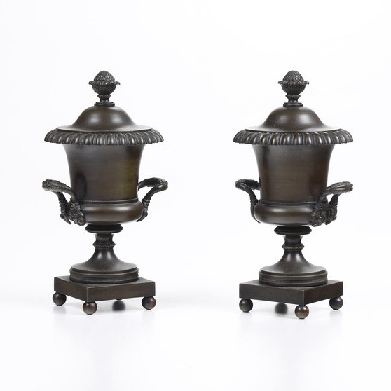 Coppia di vasi ad urna in bronzo a patina scura. XIX secolo
