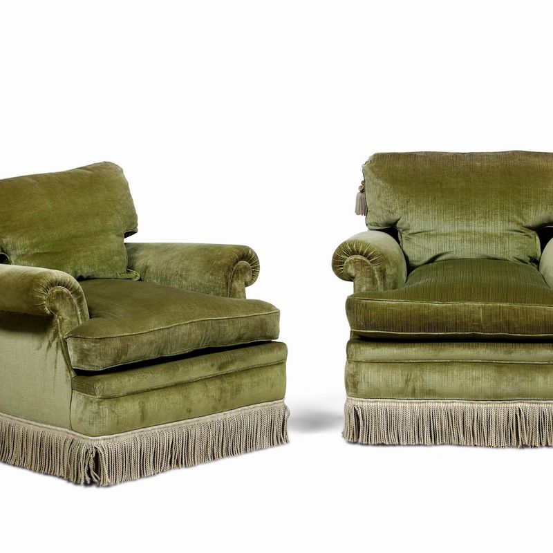Divano e due poltrone imbottiti e rivestiti in tessuto verde