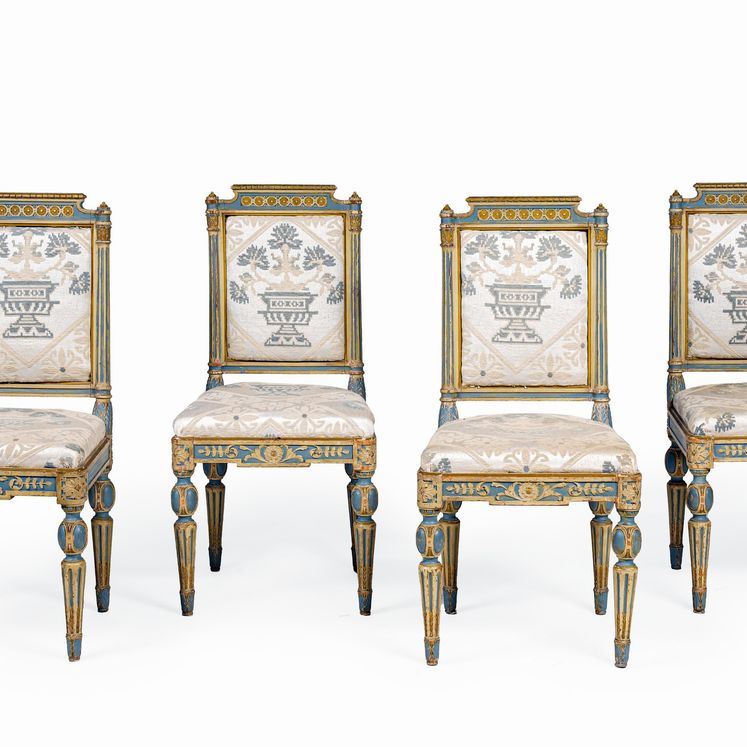 Dodici sedie in legno intagliato laccato e dorato. XIX secolo