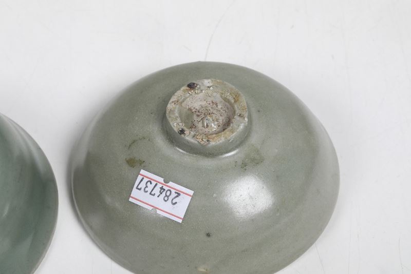 Due tazze in porcellana claire de lune con decoro inciso naturalistico, Cina, XVIII secolo