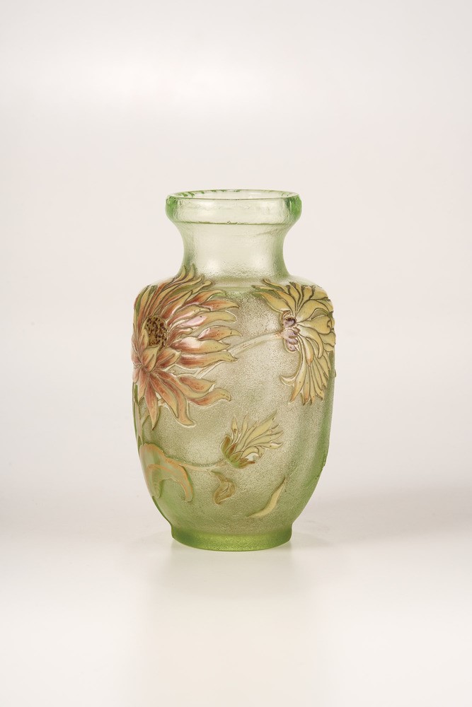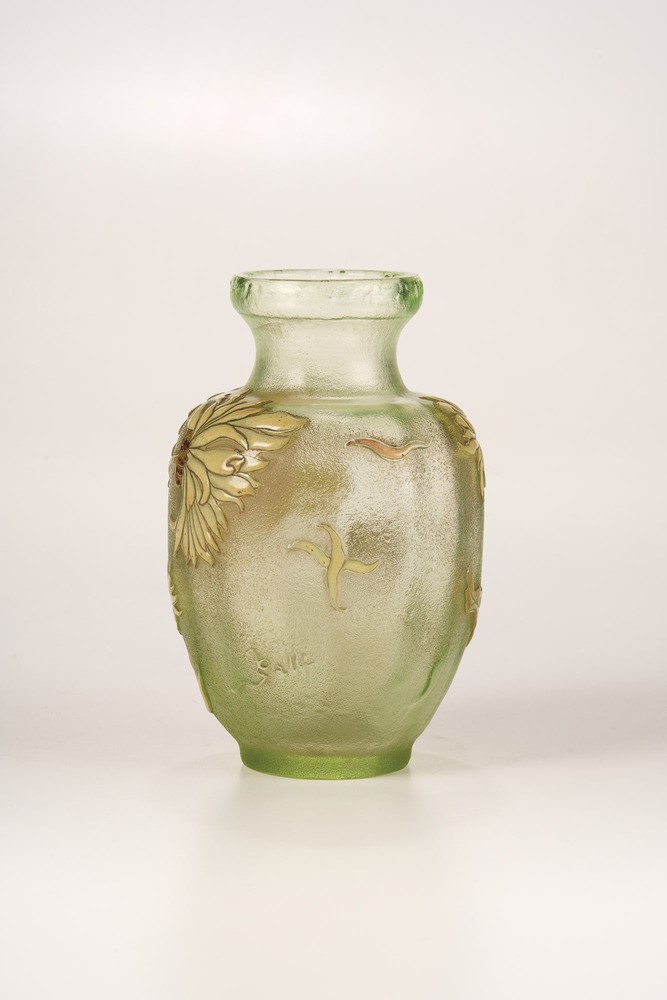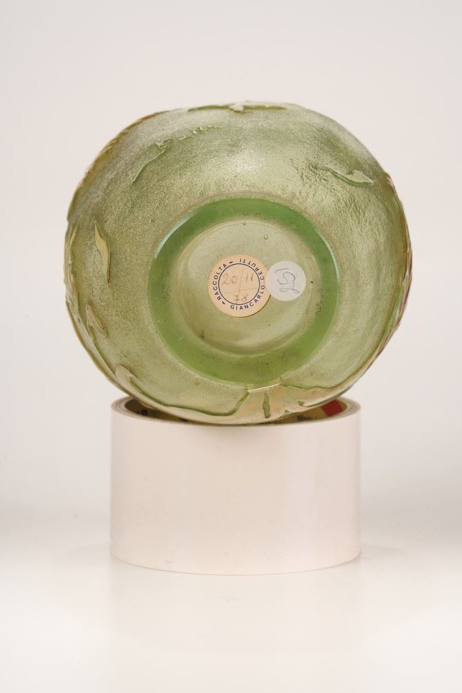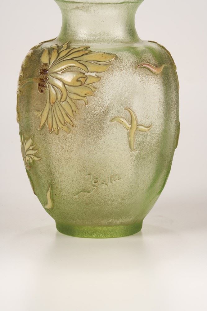 Vaso in vetro trasparente verdino con decoro floreale a cammeo e smalti.