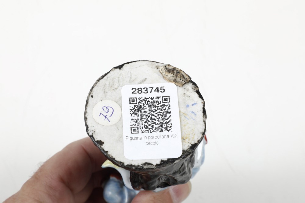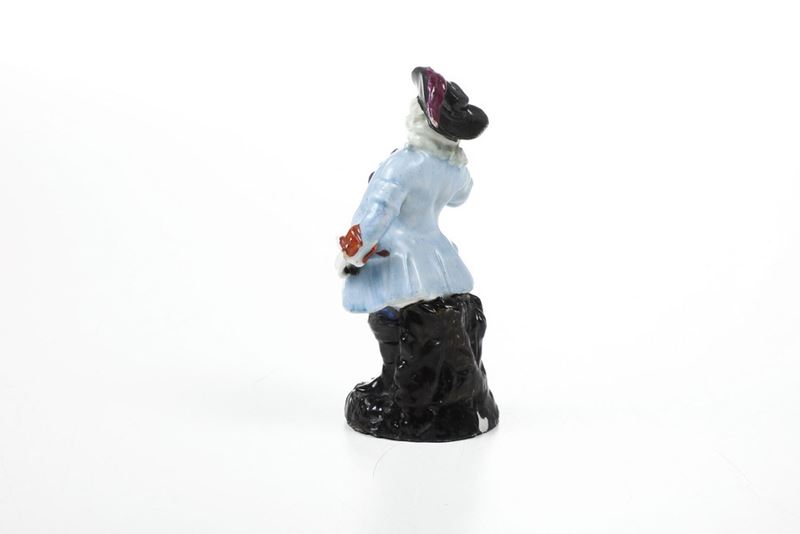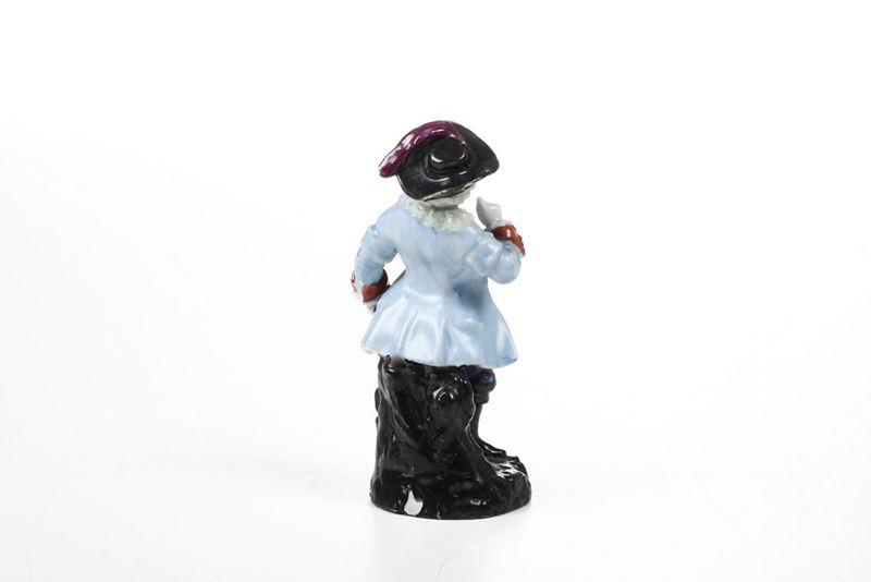 Porcellana policroma. Marca: assente. Altezza cm 12,8 Conservazione: una sbeccatura al bordo del cappello e una sul bordo della base
