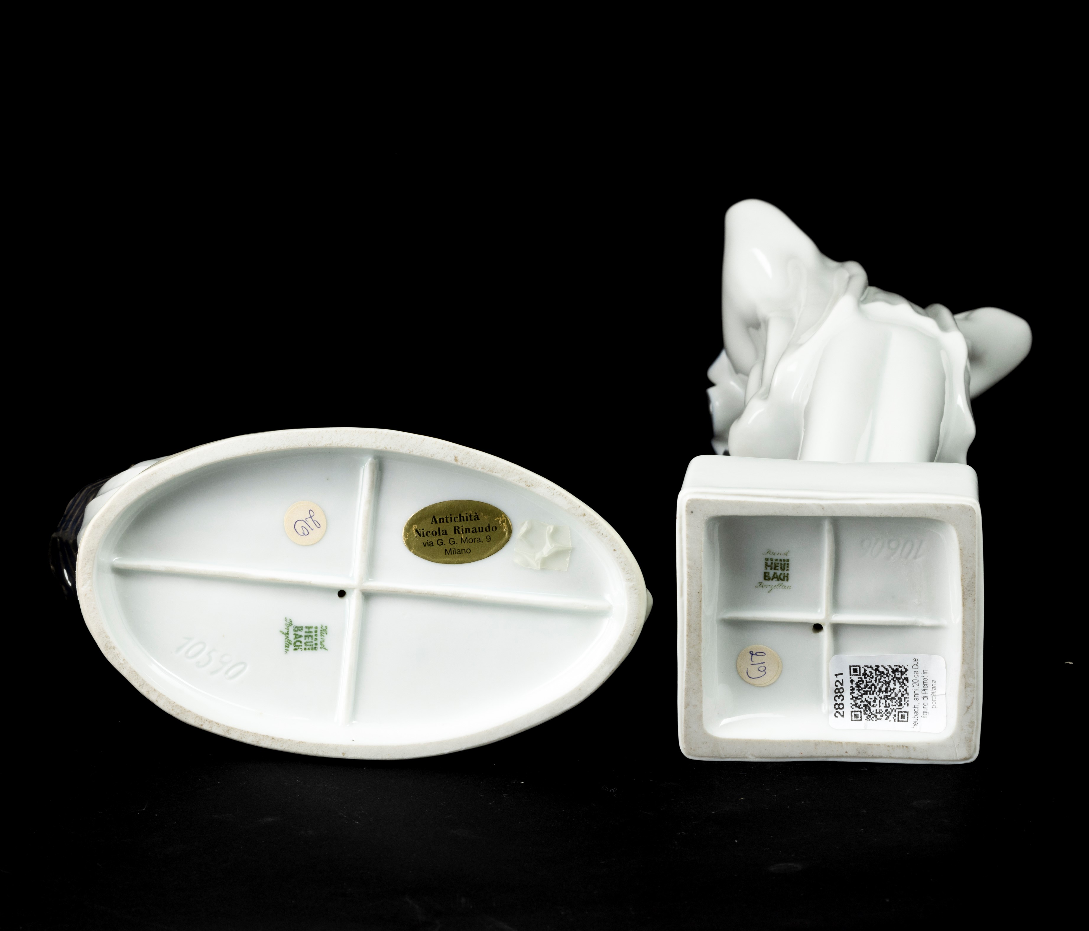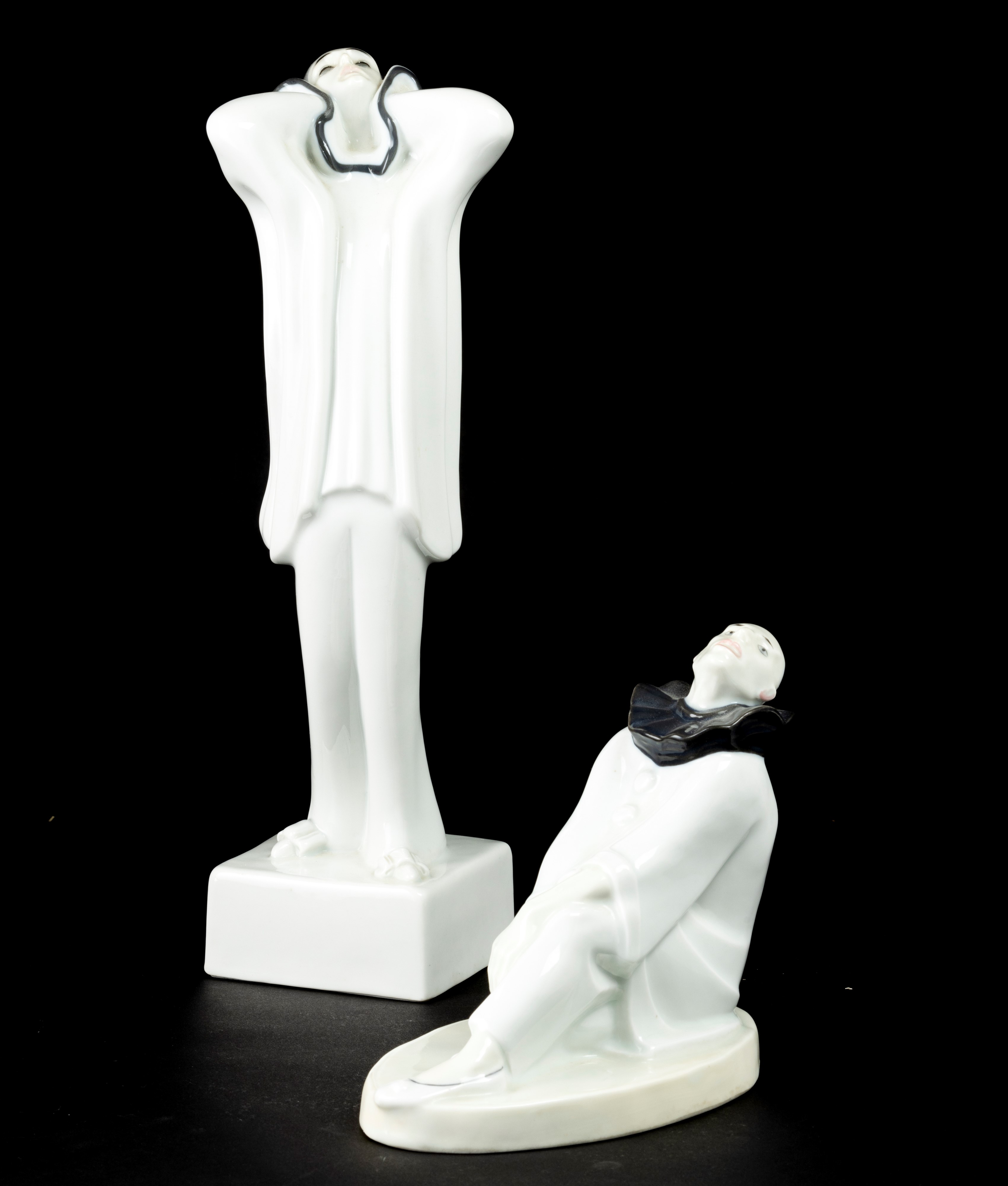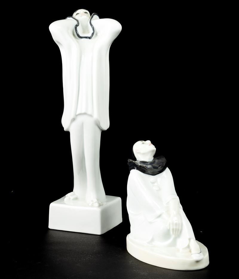 Lotto formato da due figure di Pierrot in porcellana con decoro policromo.