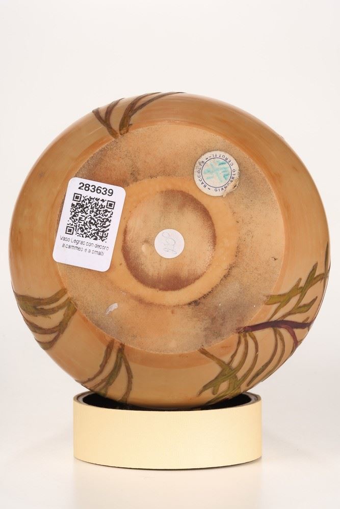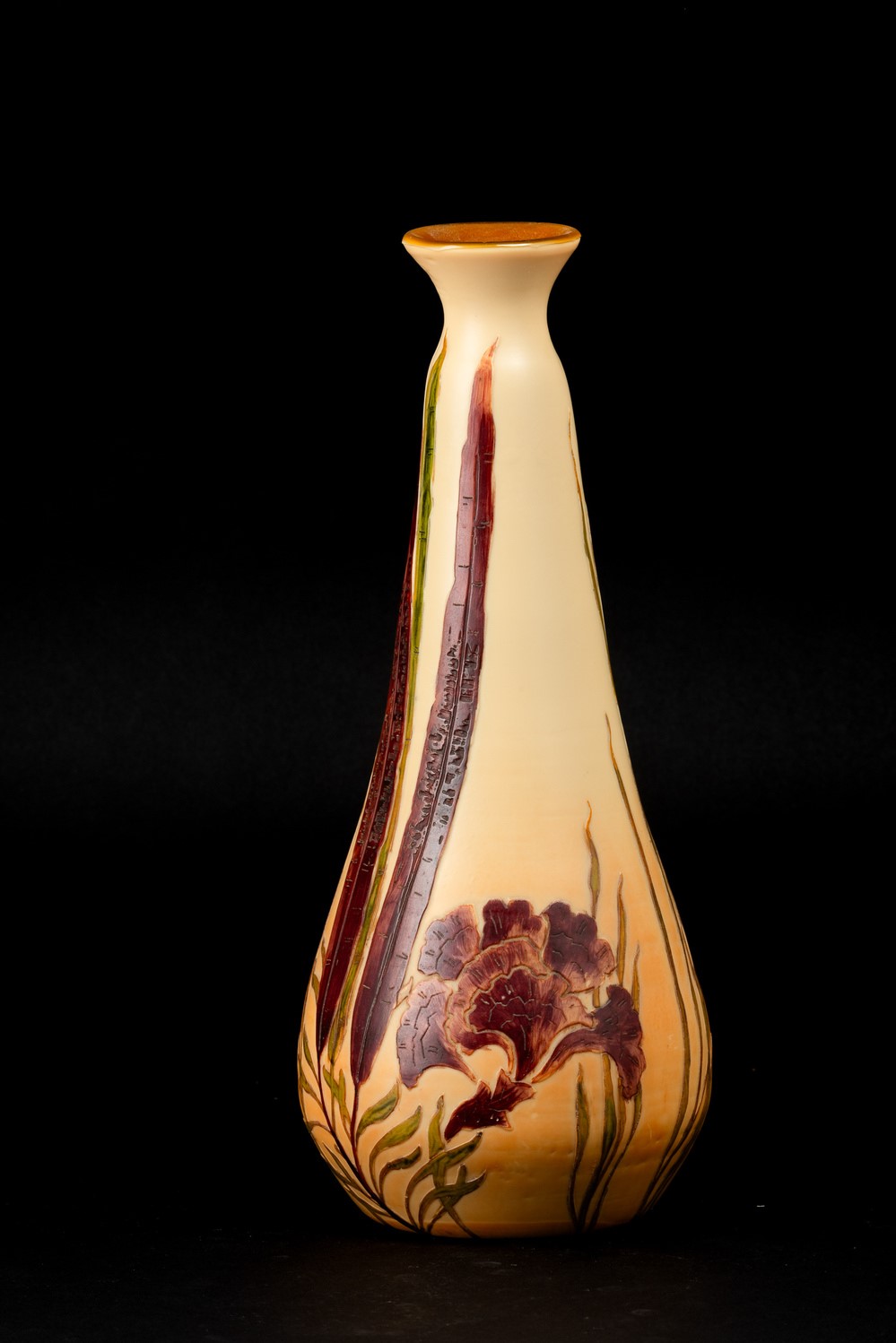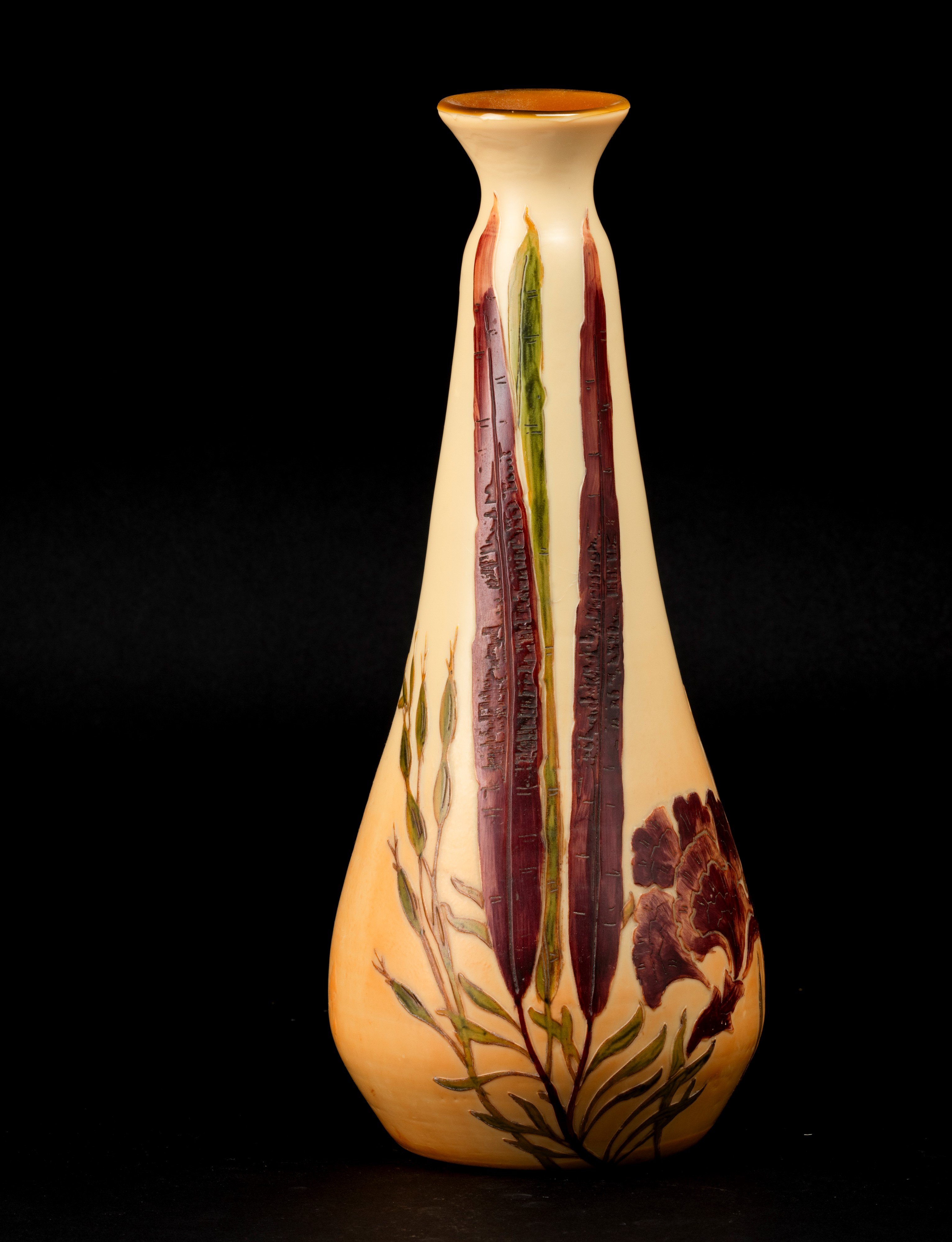 Vaso a goccia con decoro floreale a smalti e incisioni.