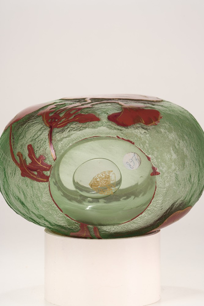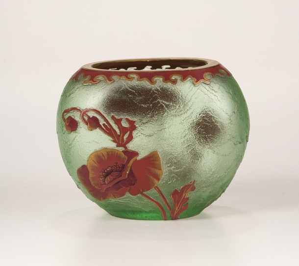 Vaso globulare a sezione ovale con decoro di papaveri a cammeo e smalti.