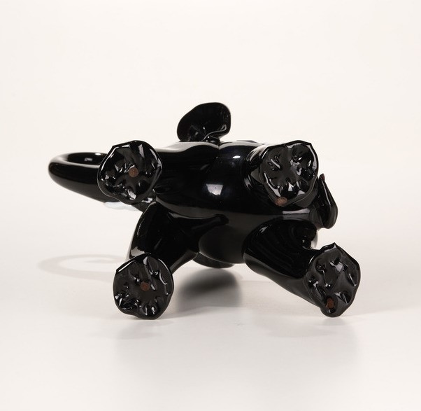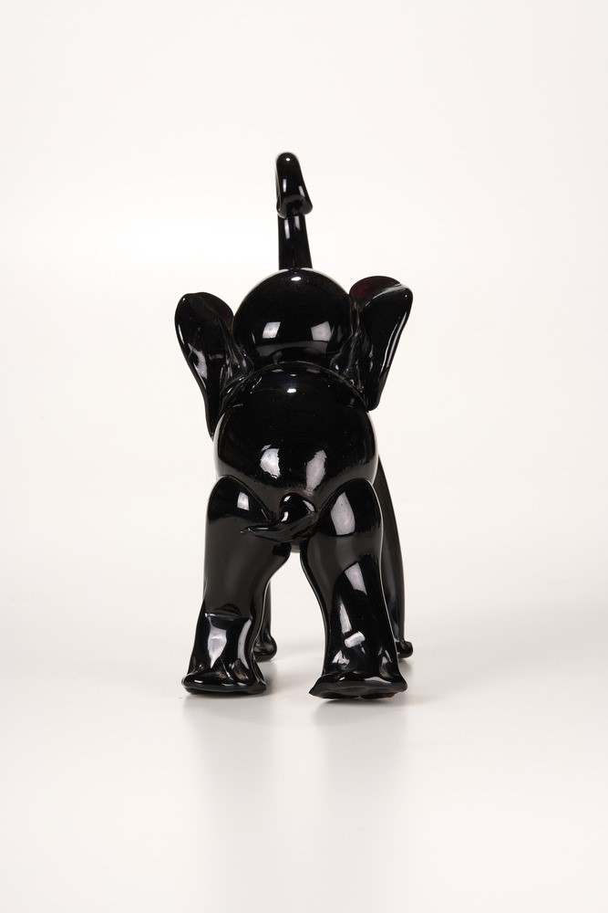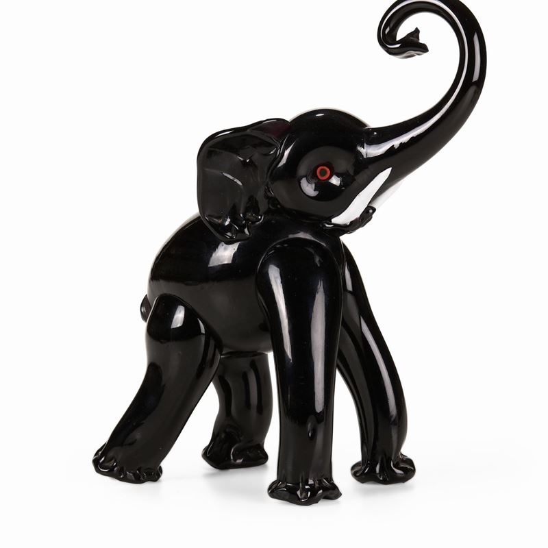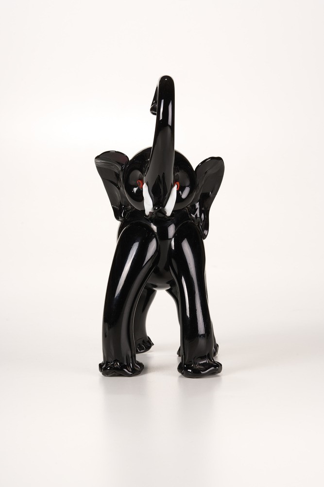 Grande elefante in pasta vitrea nera con occhi a murrina e zanne lattimo.