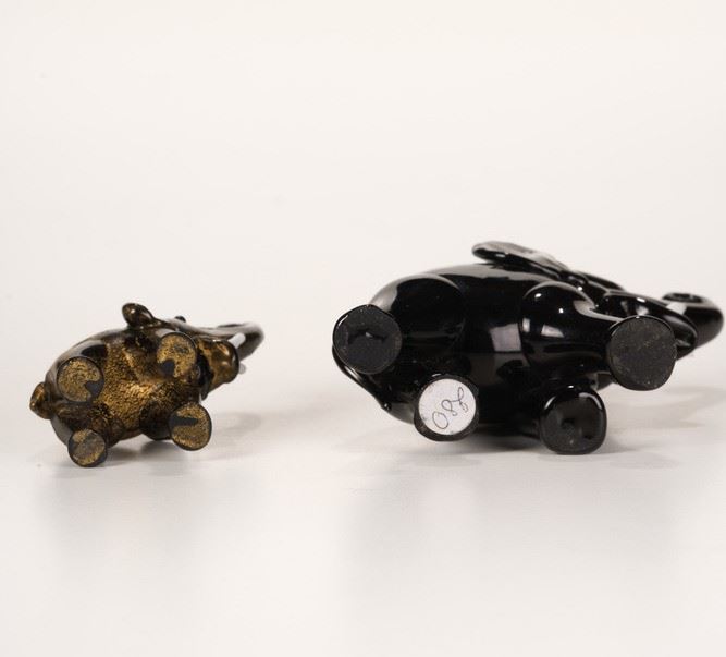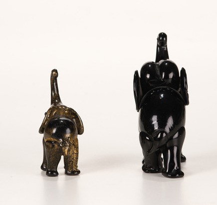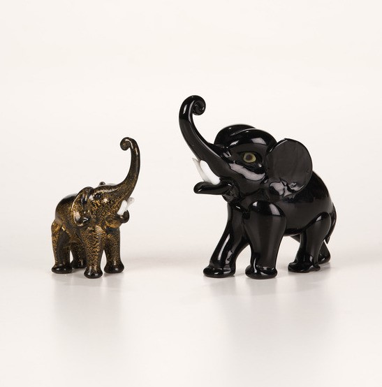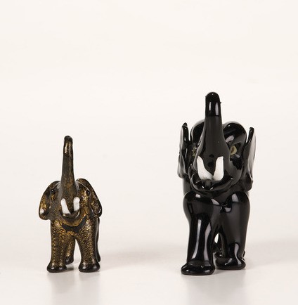 Lotto formato da due elefantini in pasta vitrea nera. Uno con decoro in foglia oro.