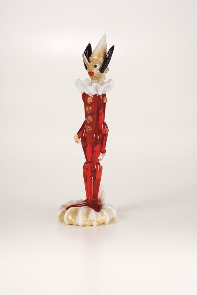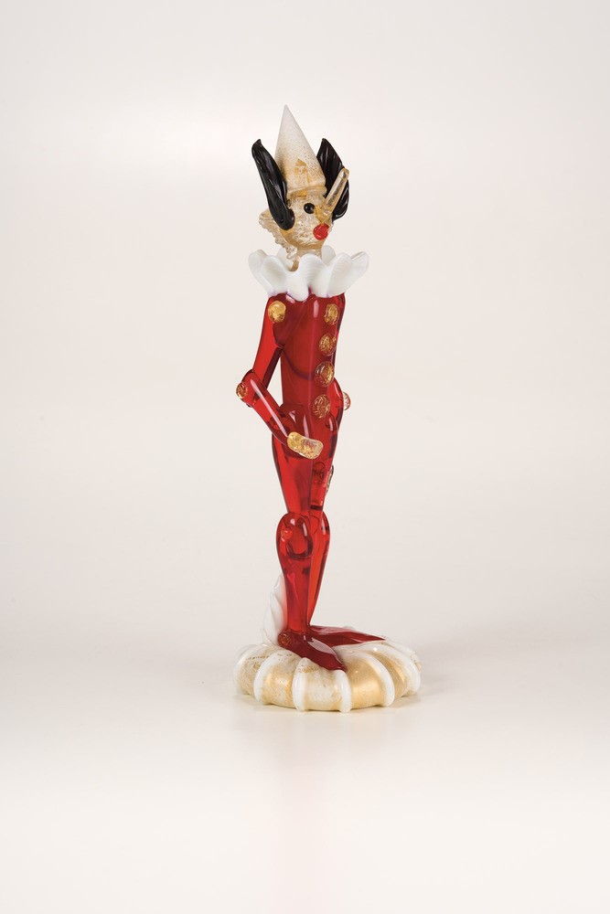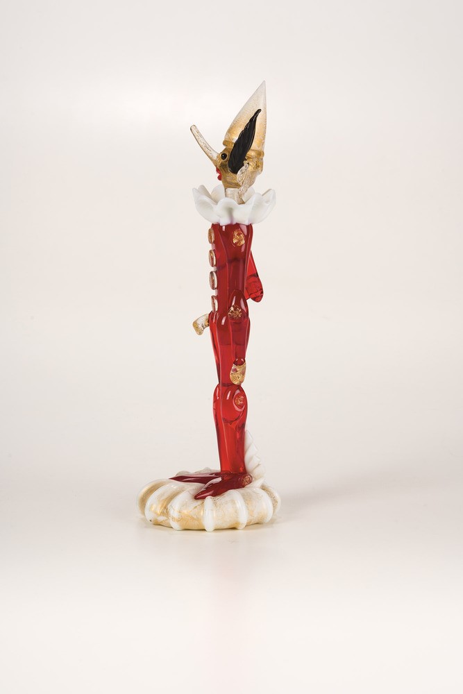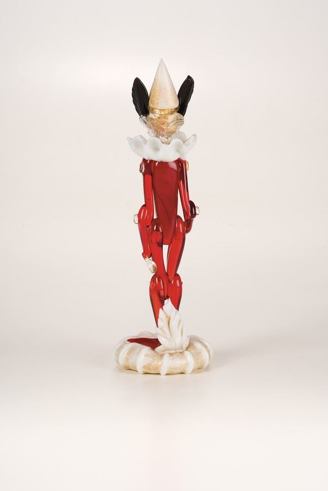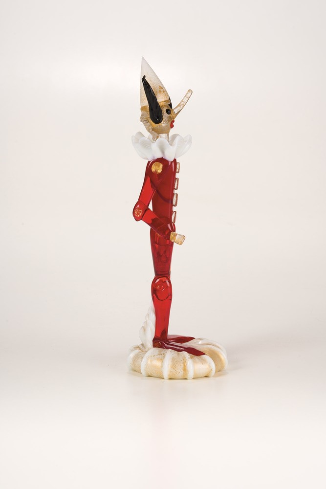 Figura di Pinocchio in vetro soffiato policromo con decoro di foglia oro.