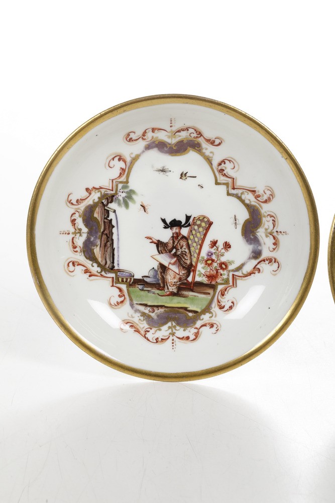 Le alte tazze slanciate dal manico a volute, sono decorate a cineserie sulla parte anteriore e sul fondo del piattino incorniciate da una riserva a “Laub- und Bandelwerk” (ossia “a foglie e nastri”) in oro, rosso ferro e lustro