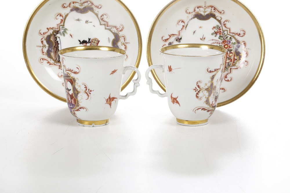 Rara coppia di tazze con piattino Meissen, 1723-1724 circa Pittura probabilmente di Johann Gregor Höroldt