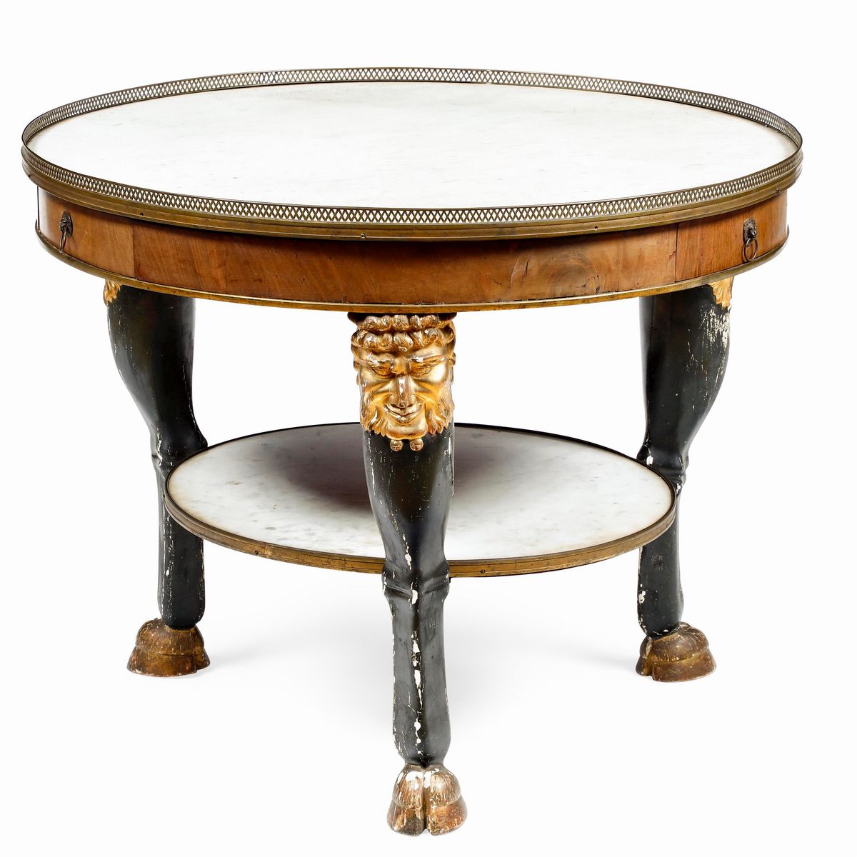Tavolo da centro in legno, lastronato, legno intagliato, dorato ed ebanizzato, XIX secolo