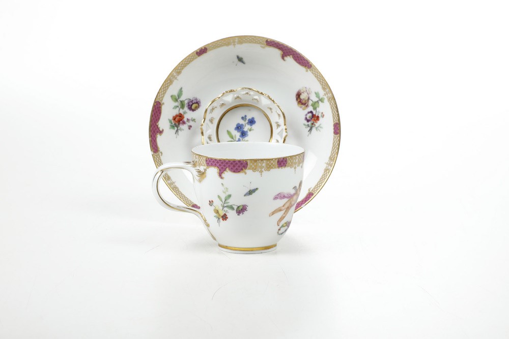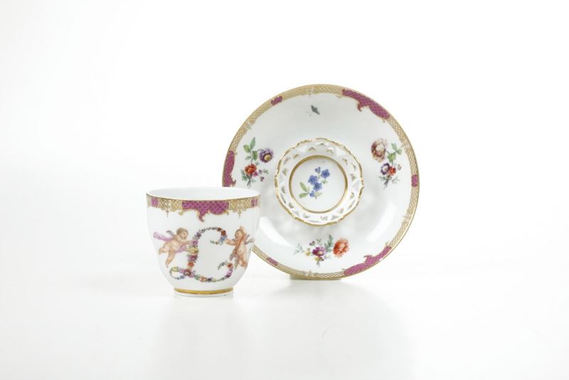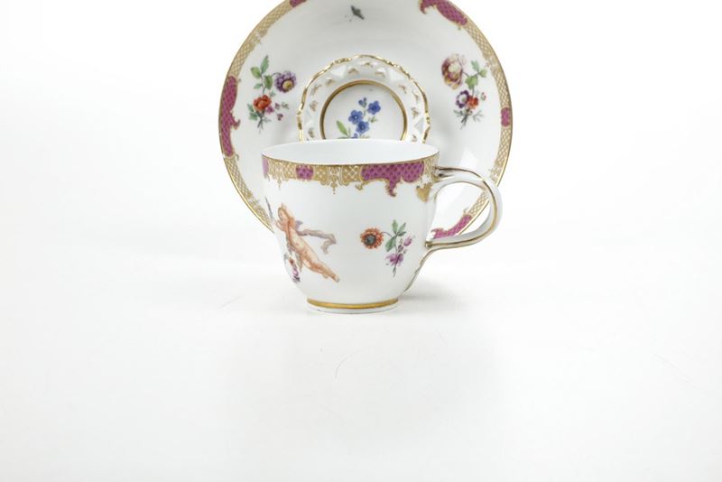 Porcellana. Marca: scettro in blu; numero "10." in oro. Dimensioni: altezza tazza cm 6,3; diametro piattino cm 13,3. Conservazione: ottima; due insignificanti sbeccature al bordo del piattino. Provenienza: S.Giusti/U.Podestà Antiquari Milano, come da etichetta cartacea