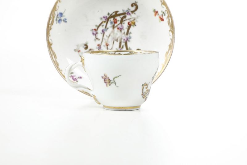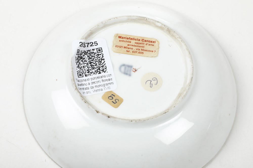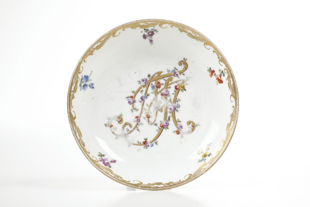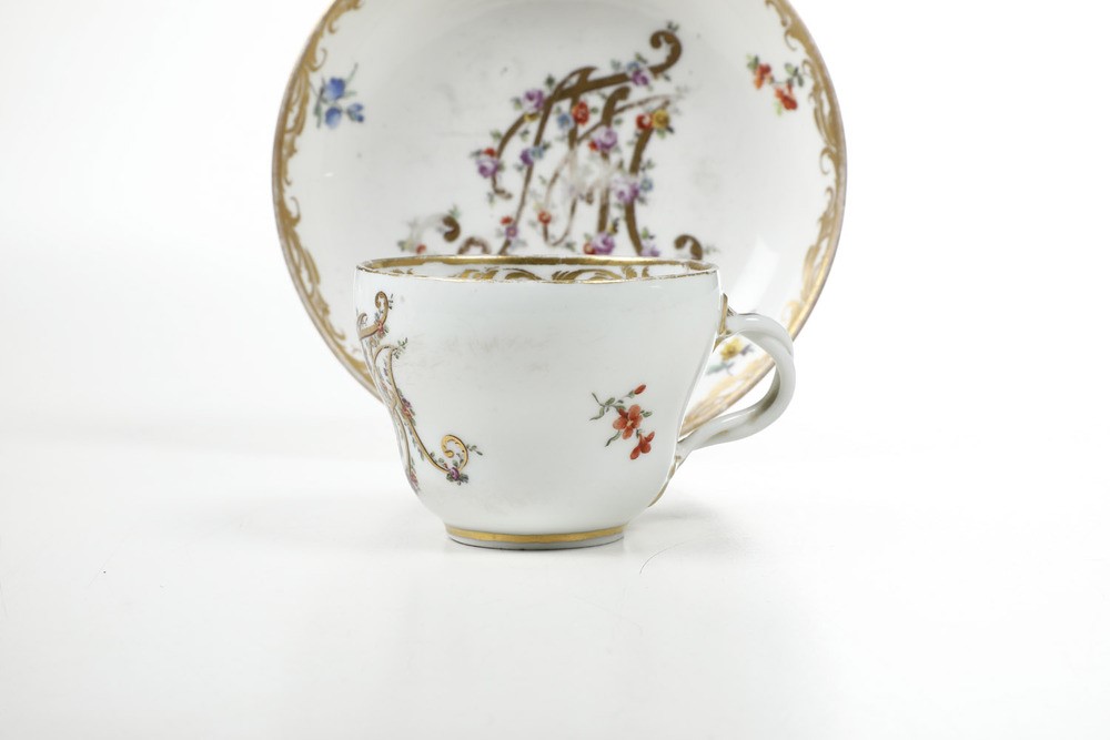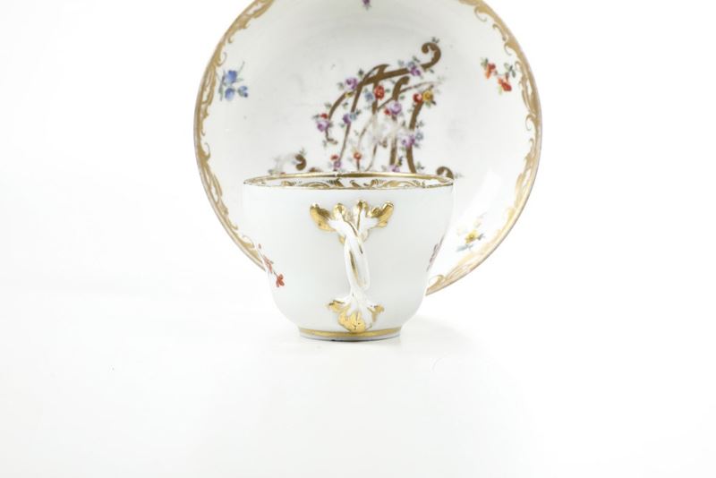Tazza e piattino con monogramma "MT". Il piattino è stato eseguito presso la manifattura imperiale di Vienna mentre la tazza è un rimpiazzo eseguito in epoca moderna