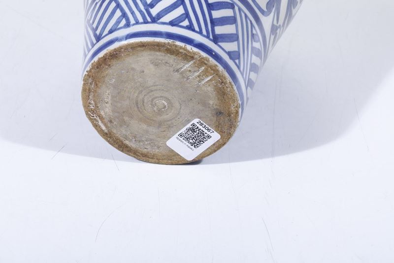 Maiolica policroma. Marca: assente. Altezza cm 40. Conservazione: rotture al bordo superiore e felature restaurate