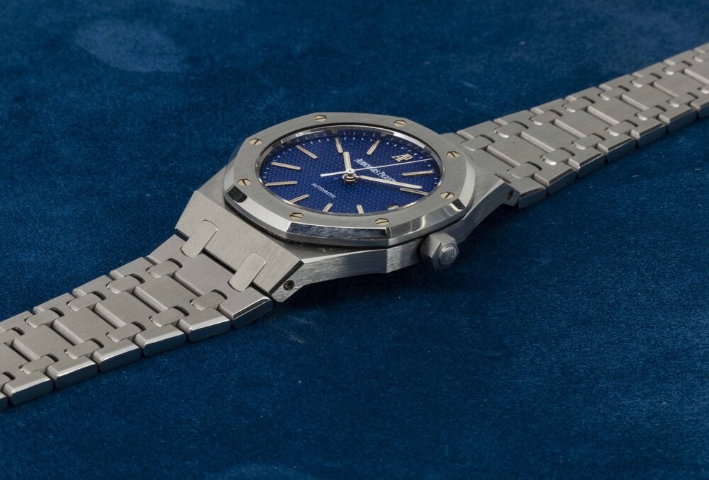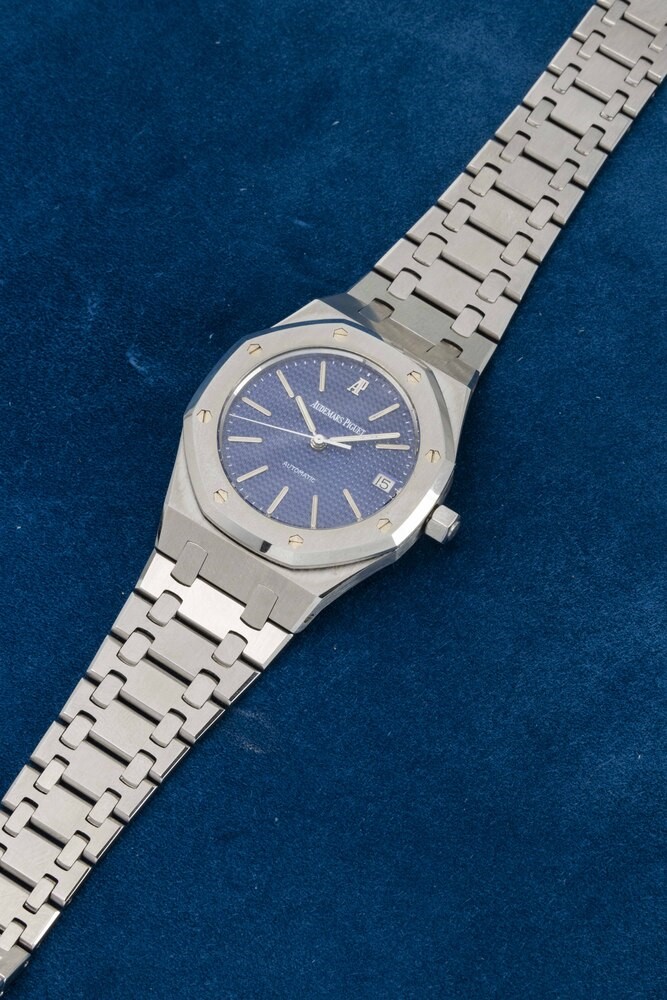 This particular piece features a vibrant blue dial, rarely seen, dubbed by collectors "Yves Klein", for its resemblance to the deep blue hue first mixed by French artist Yves Klein. Evidence suggests that the dial was manufactured by Stern Creations, the famous dial manufacturer who also made the dials of the original Royal Oak ref. 5402.