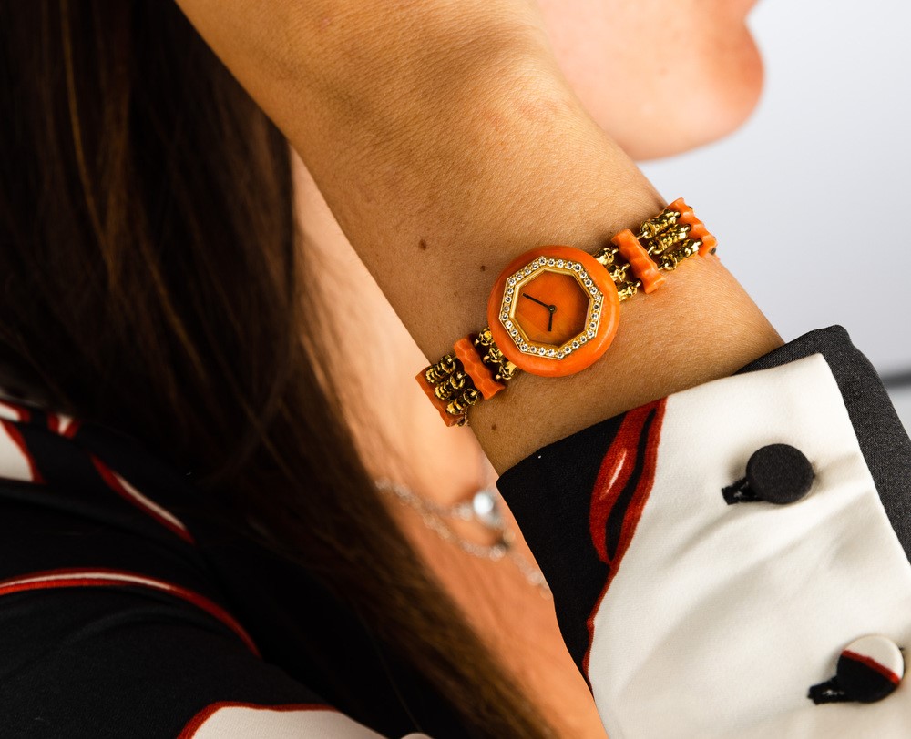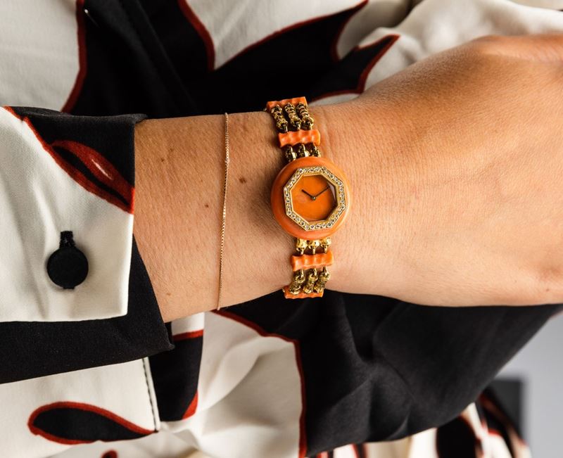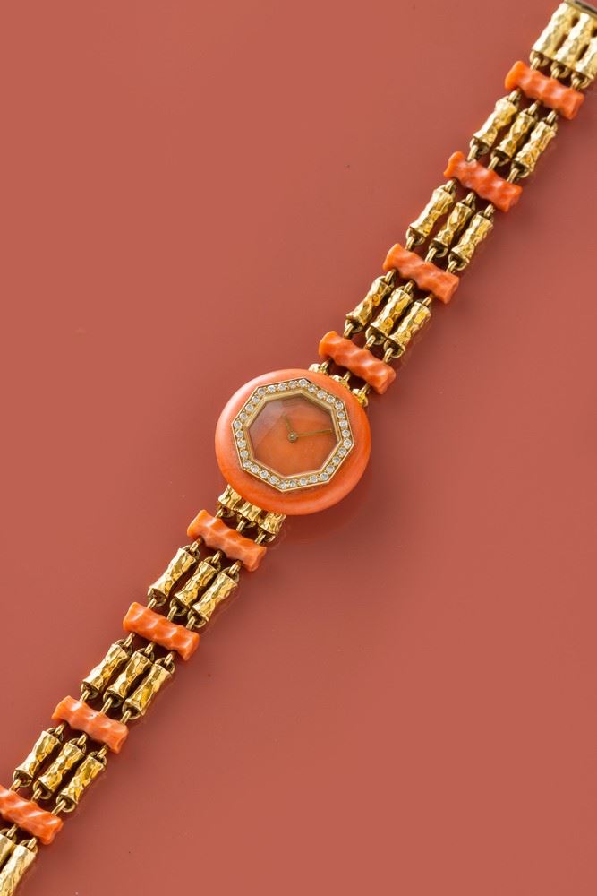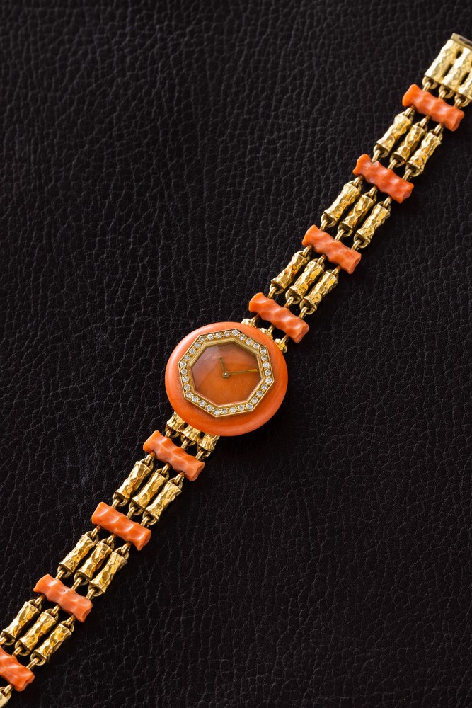 Refined and particular evening Boucheron in yellow gold, diamonds and hard stone alternated in the bracelet "Bamboo", hidden manual charge