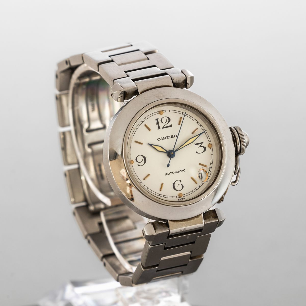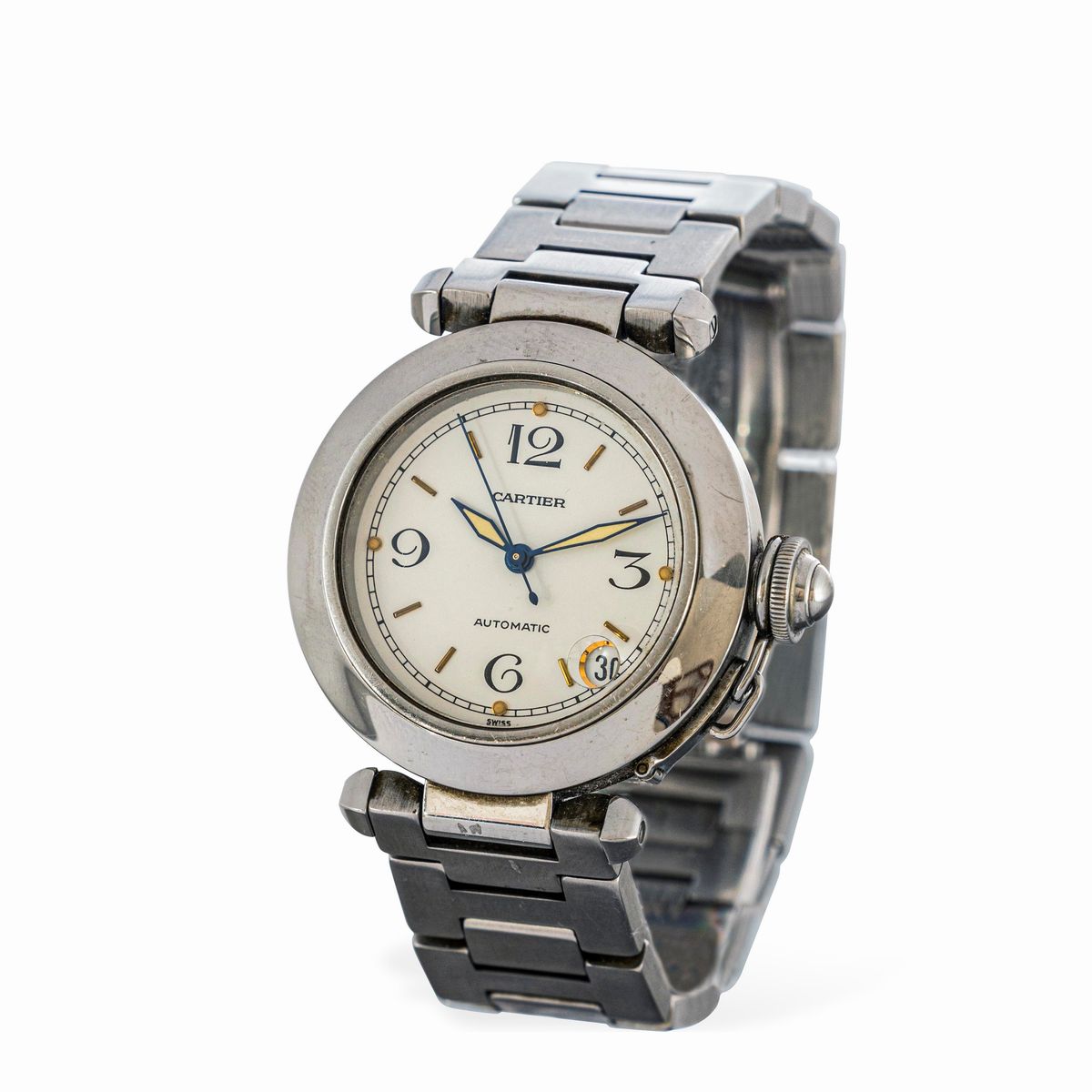 Pashà automatic in steel, white dial Arabic numerals with date window, luminescent hands invisible clasp
