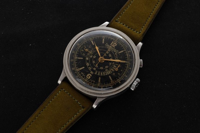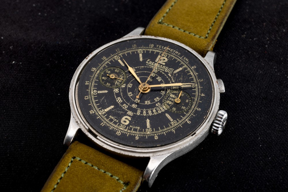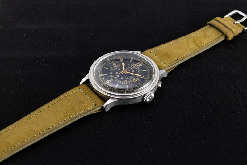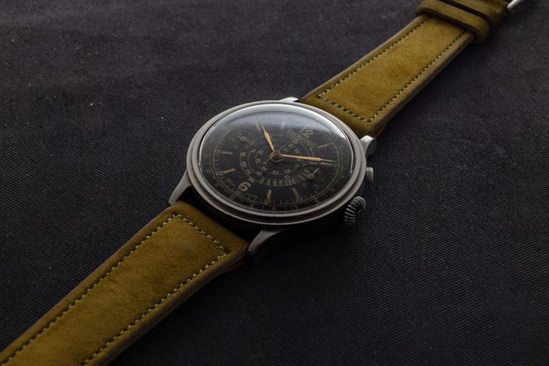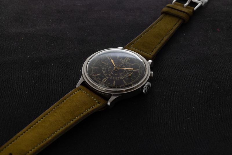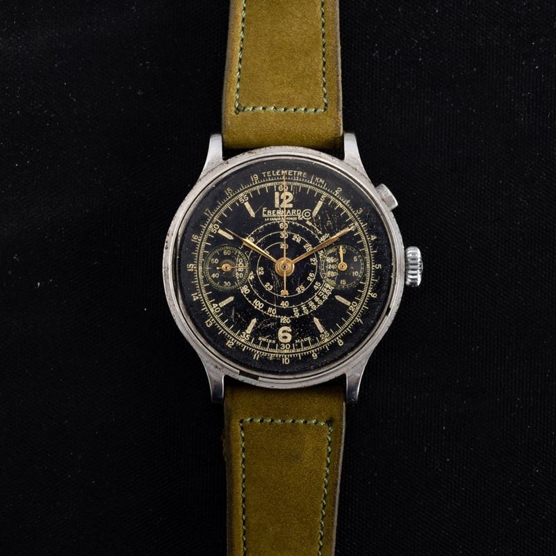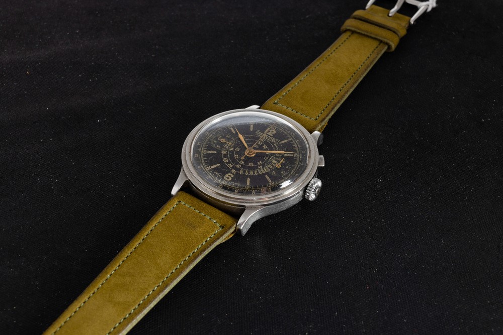 Rare Pre Extrafort chrono monopusher with black Gilt dial, step steel case, hand-wound movement and snap caseback