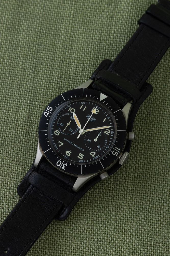 The Heuer Bundeswehr Flyback chronograph was made for the German army between the 1960s and 1970s and is one of the most desired chronographs by collectors. There were several variants of the "Bund" and the rarest specimen we see here is the "Sternzeit Reguliert".