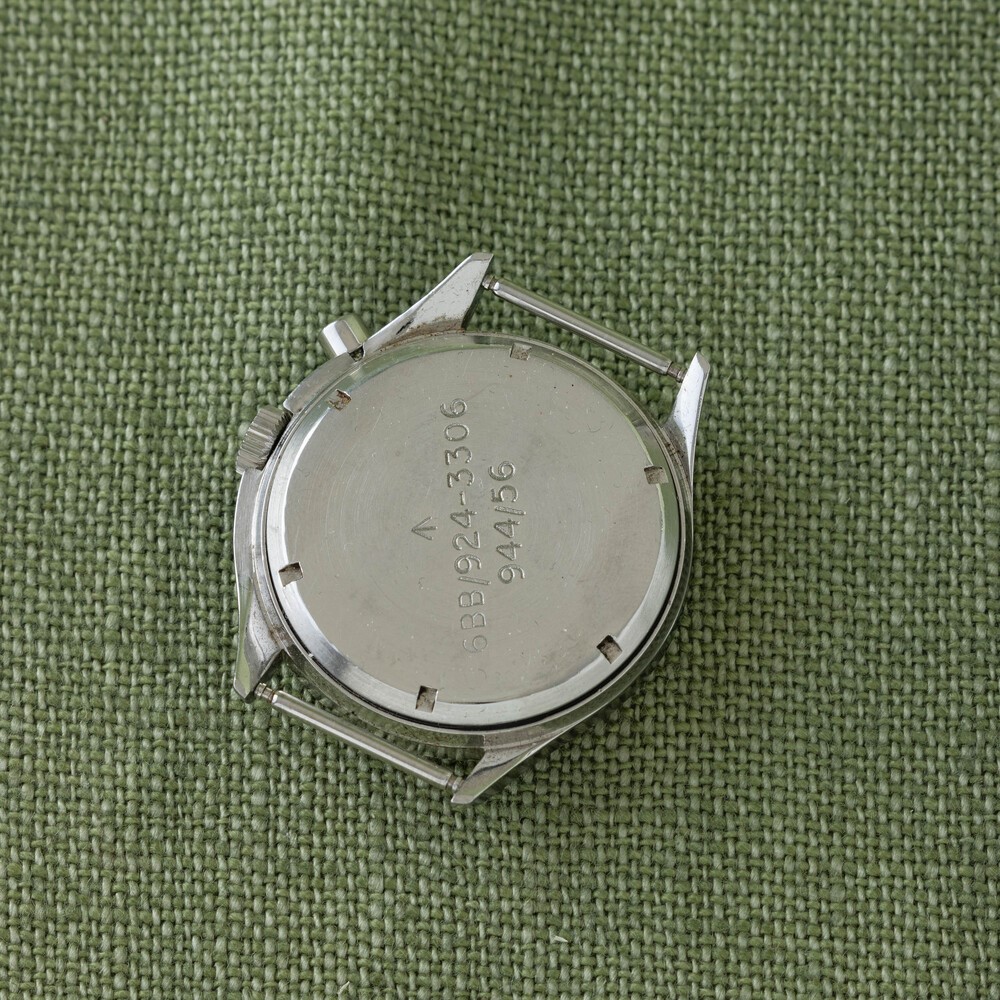 Rare monopusher chronograph with two steel subdials with screw-down case back assigned to the British Air Force, glossy black dial, spheres and luminescent Arabic numerals