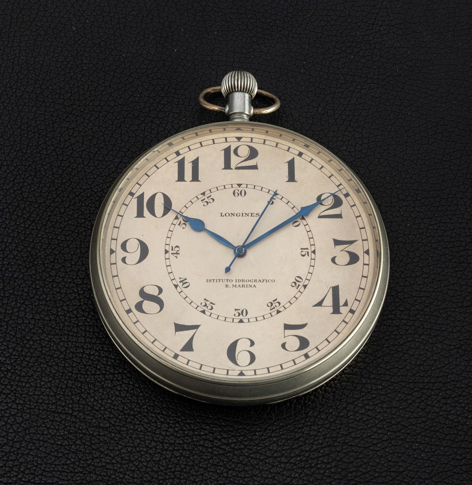 Rare steel desk chronometer supplied to the Istituto Odrografico Regia Marina Italiana, silver dial with painted black Arabic numerals and internal minuteria, manual winding and hinged bottom with assignment number