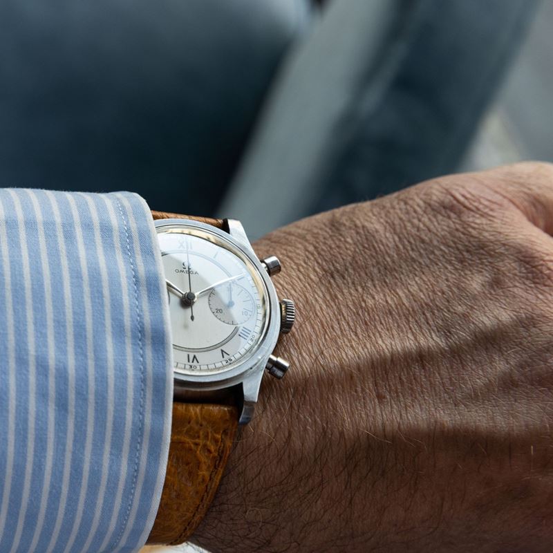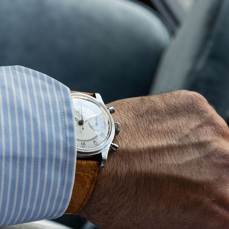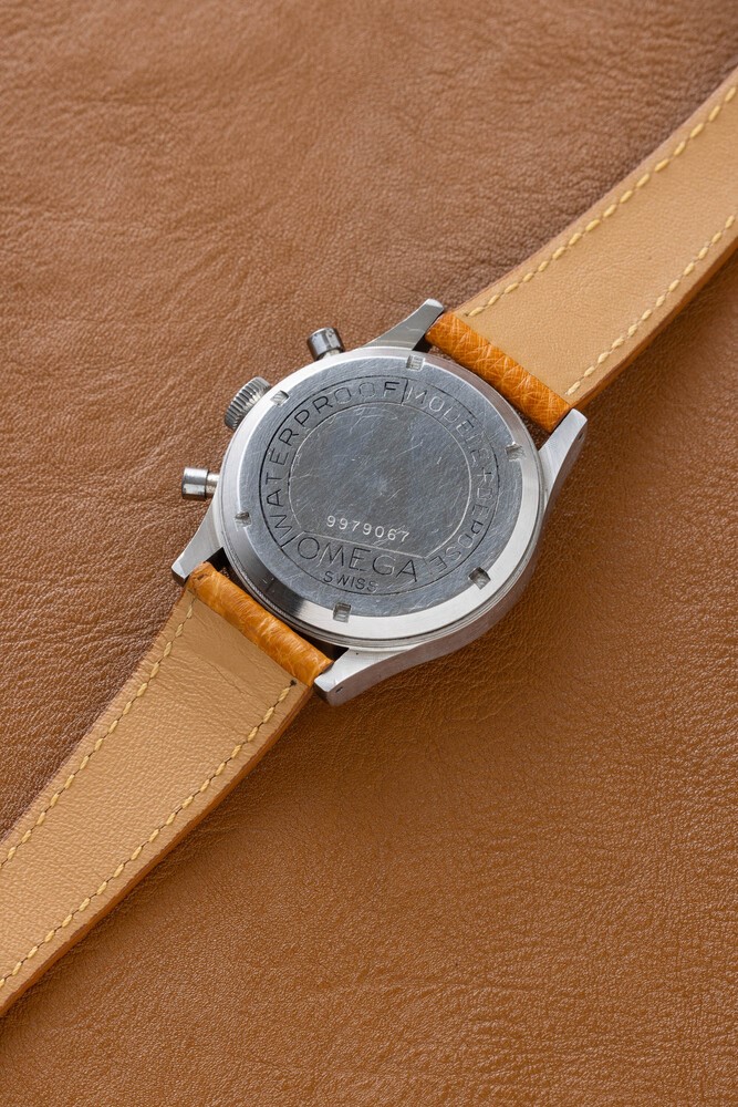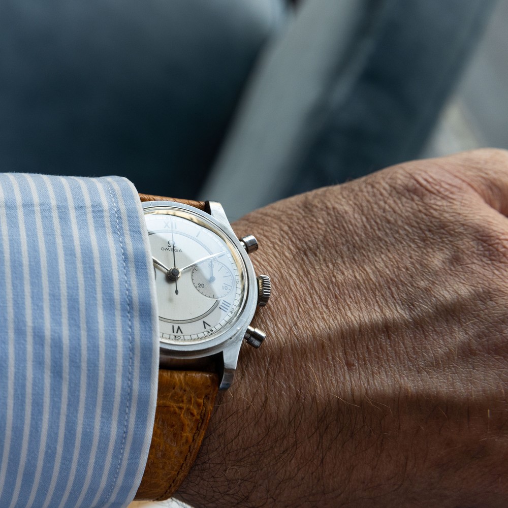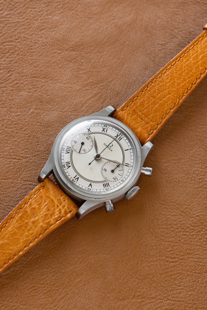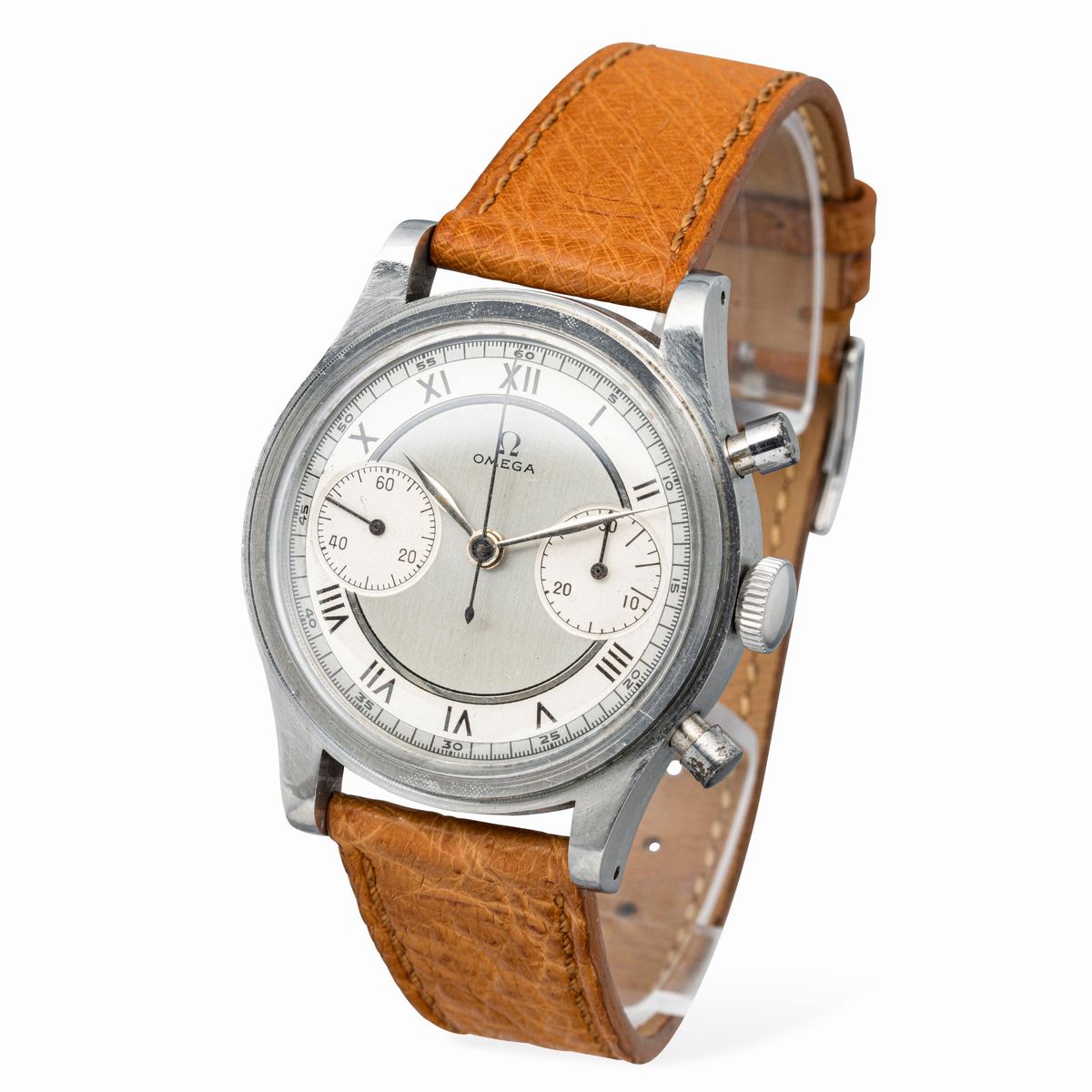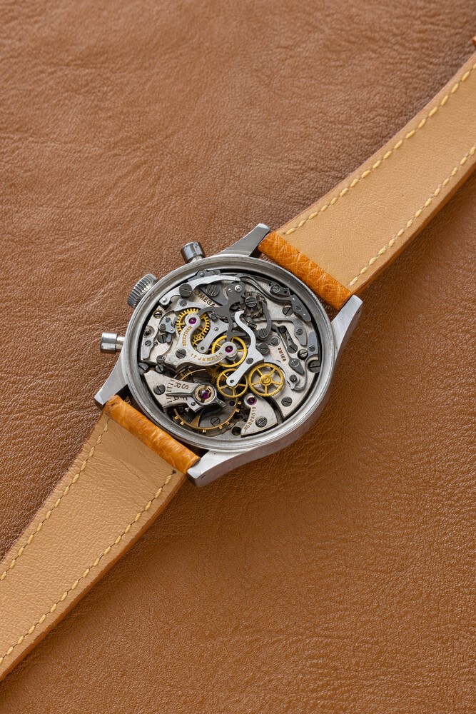 Extremely rare two-counter chronograph with pump pushers, grey Lemrich dial with Roman numerals, 33.3 caliber manual winding, [..]