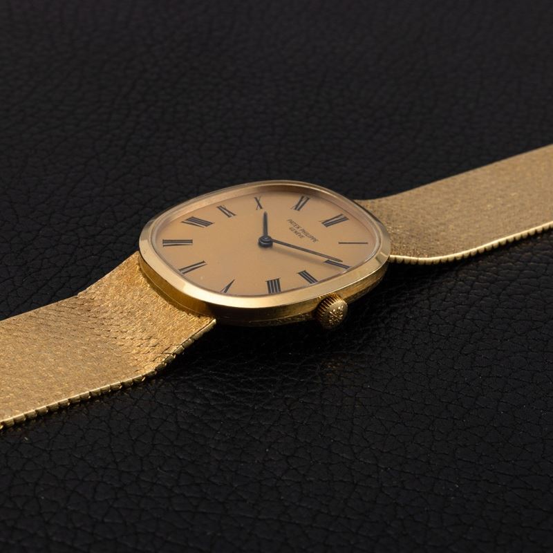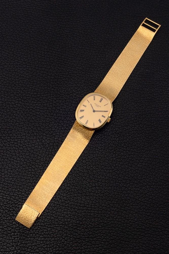 Classic Ellipse ref 3548 in 18k yellow gold with integrated bracelet, champagne dial with black lacquered Roman numerals