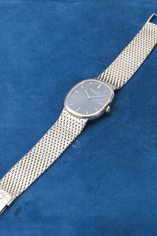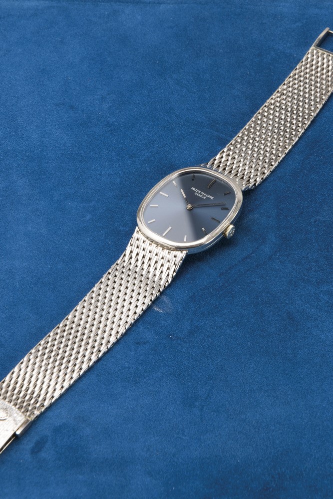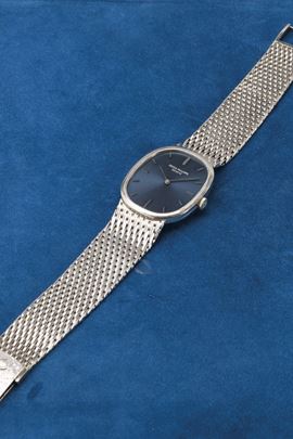 Elegante Ellipse in oro bianco 18k con bracciale integrato a maglia intrecciata, quadrante blu soleil Sigma, movimento automatico con punzone di Ginevra