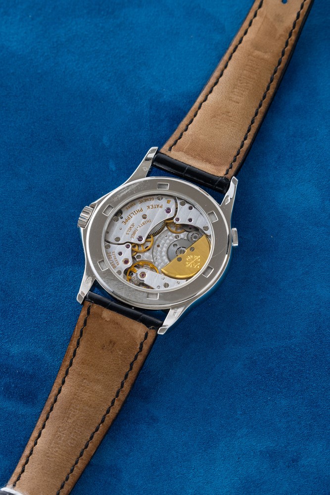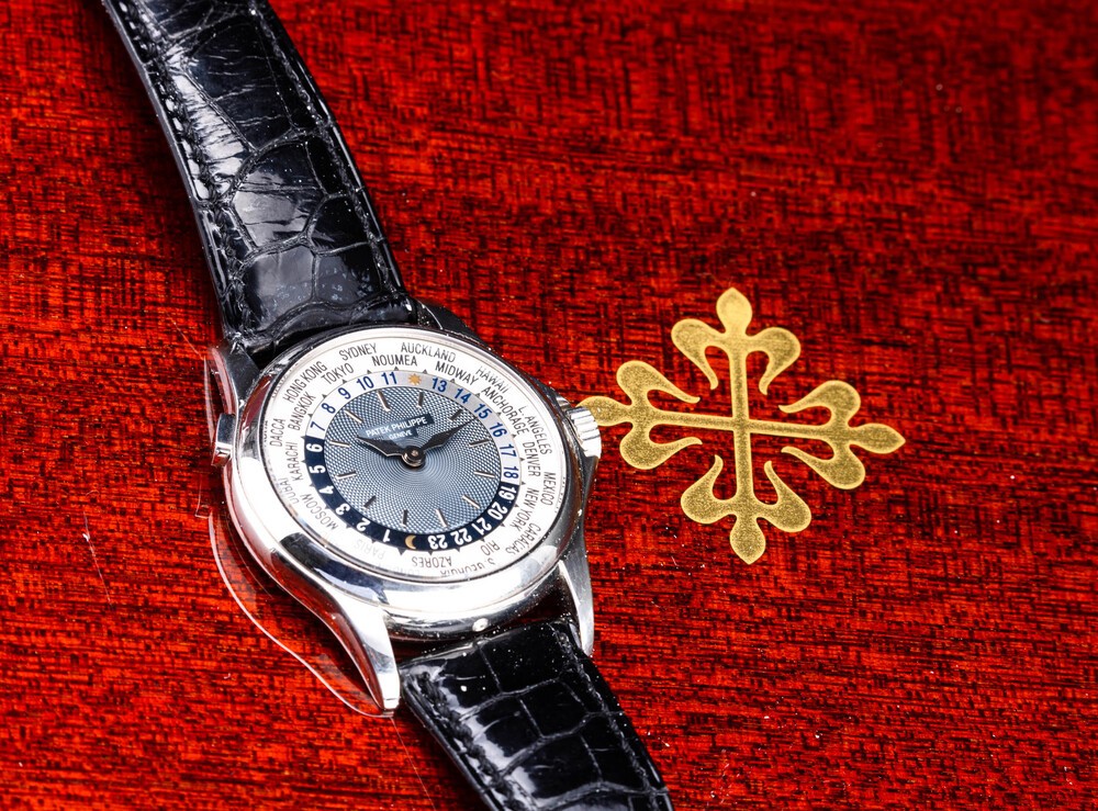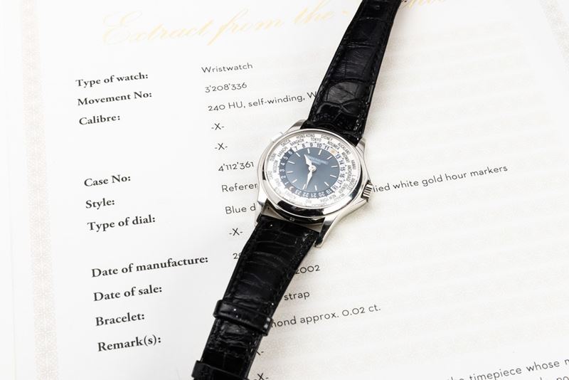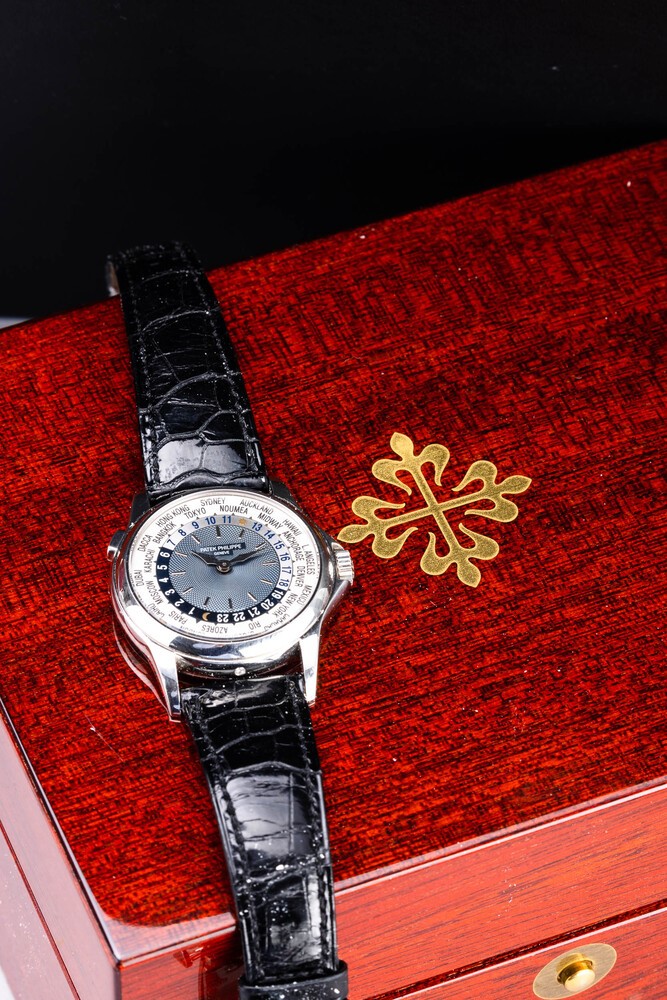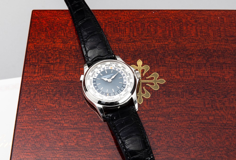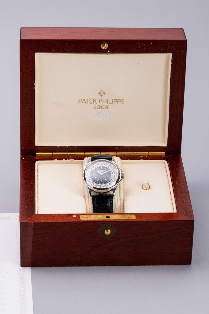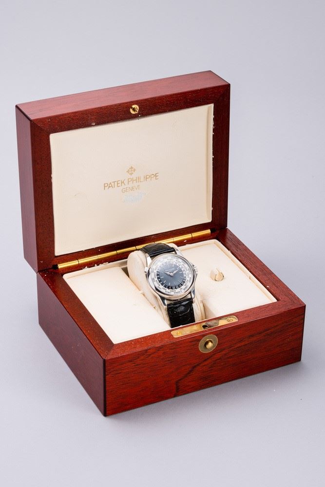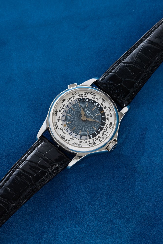 Reference 5110 was introduced in 2000 and remained in production until 2006, leaving room for reference 5130. The present watch, made in platinum has a classic Calatrava case, the blue guilloche dial and a revolving ring with 24 city names. This elegant watch, icon of the Patek brand, allows the wearer to keep track of both local and home time with the click of a button located at 10 o'clock.