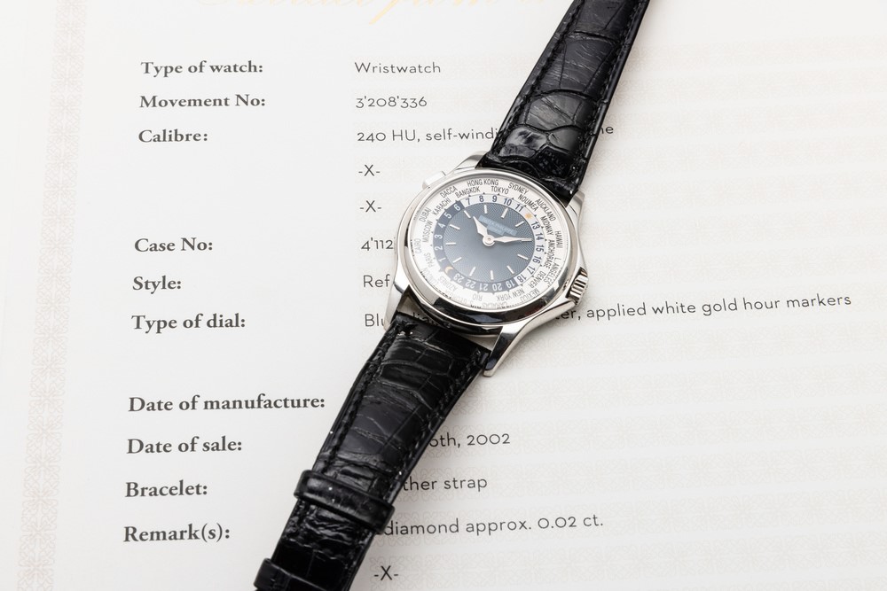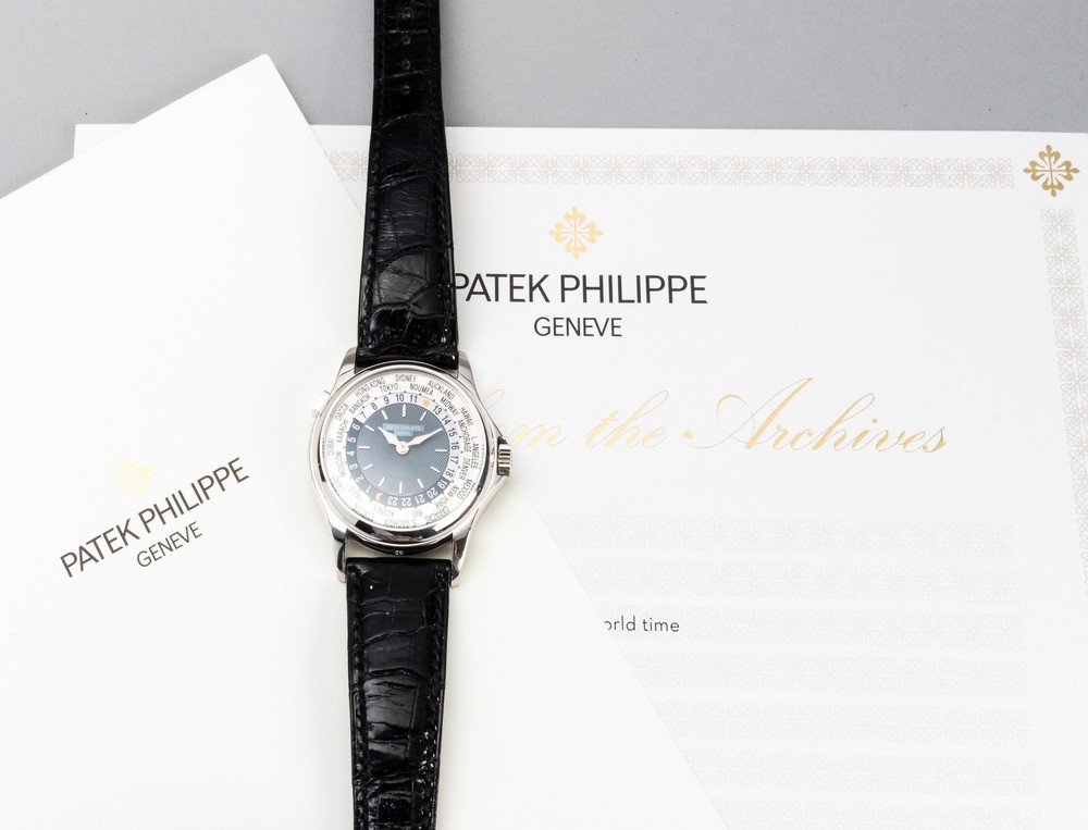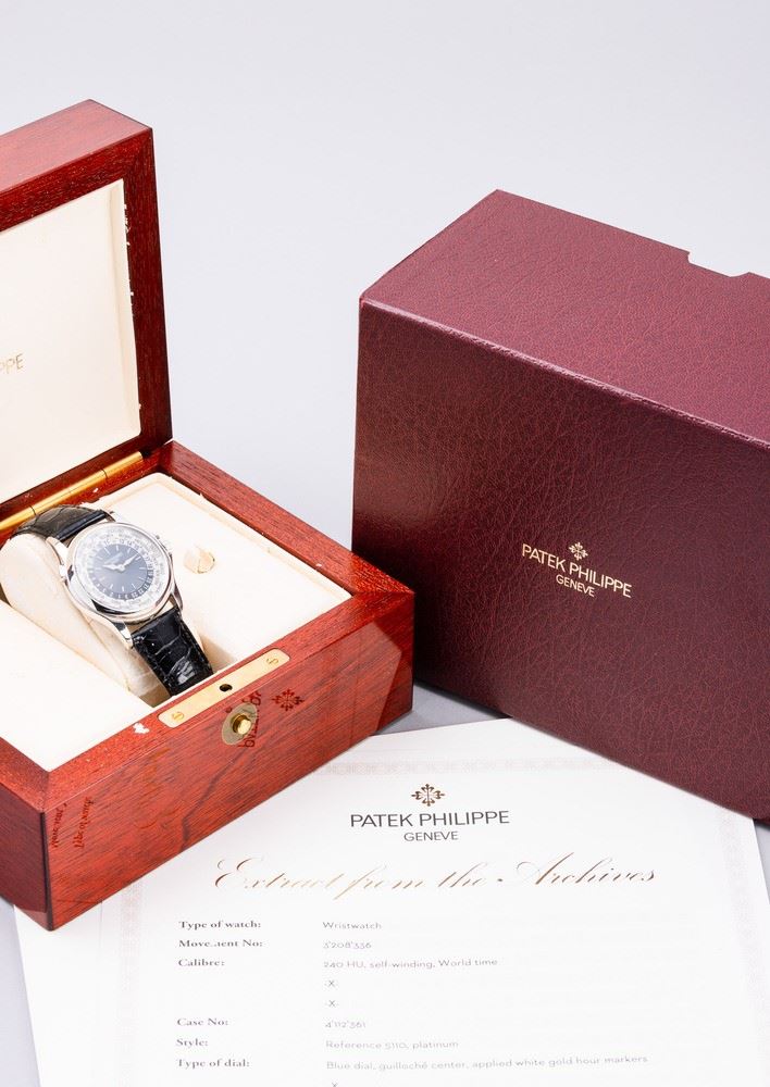 Fine and attractive Worldtime ref 5110P in platinum 950, blue dial with circular Guillochè, disc with 24 revolving time zones operated by push button at 10 o'clock accompanied by Extract from the Archive