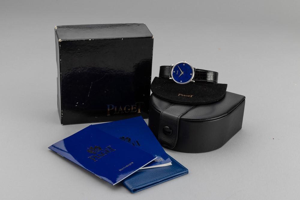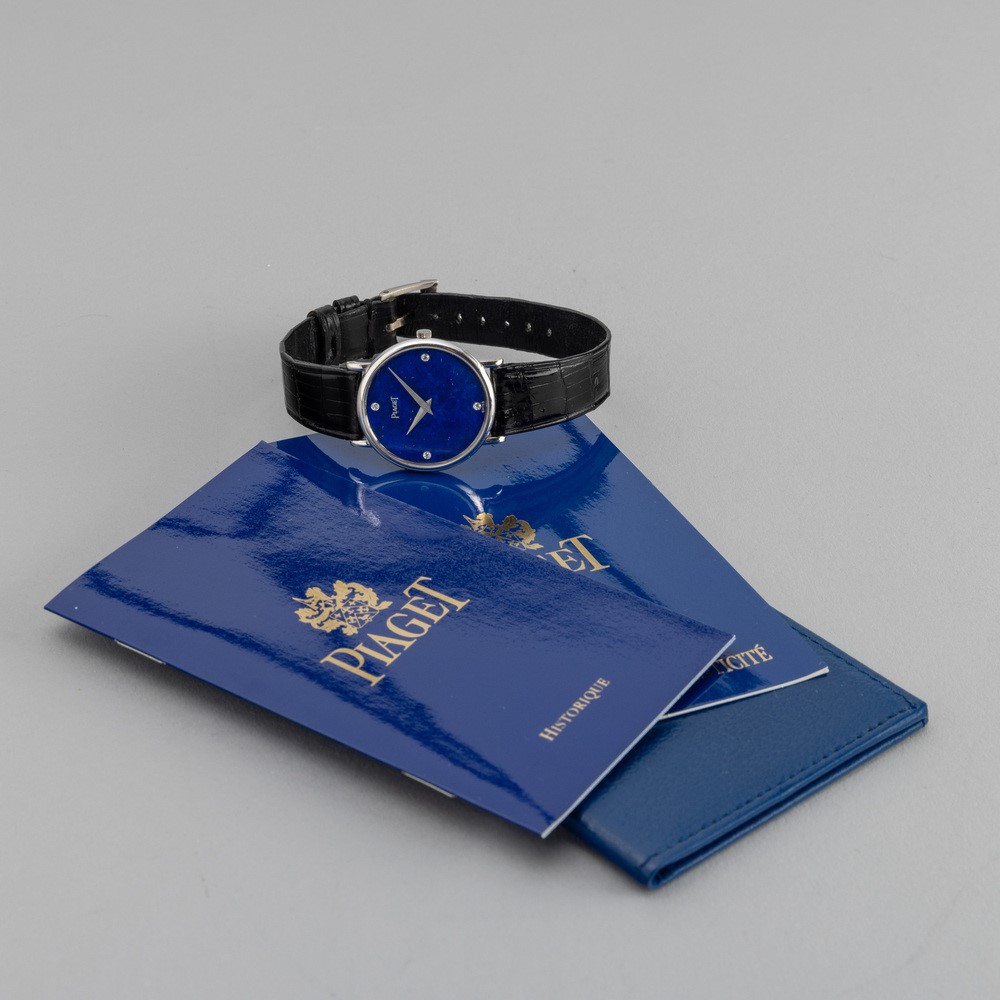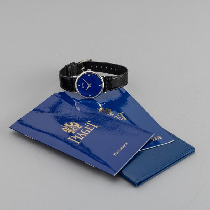 Fine evening watch in white gold lazuli lapis dial with diamonds at cardinal points, manual winding