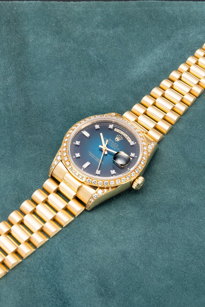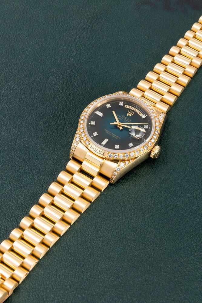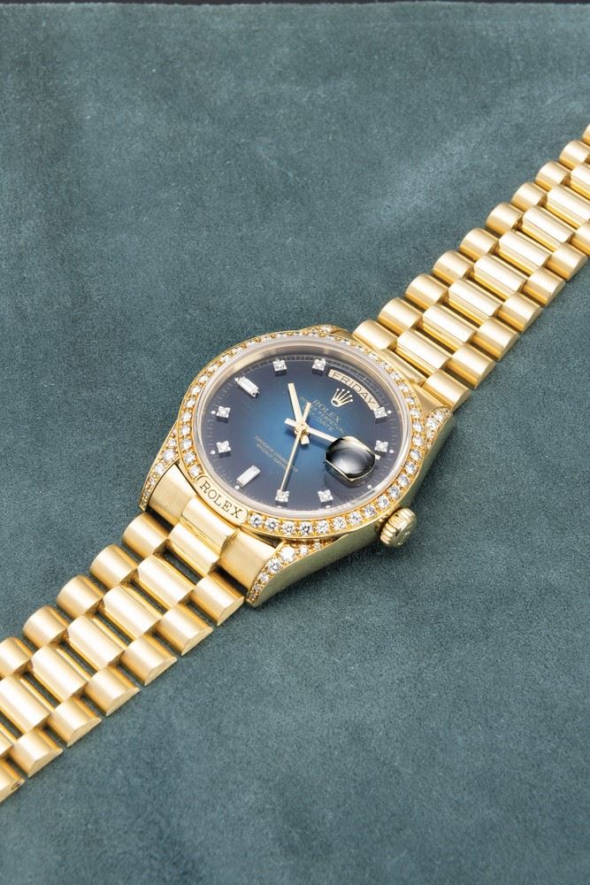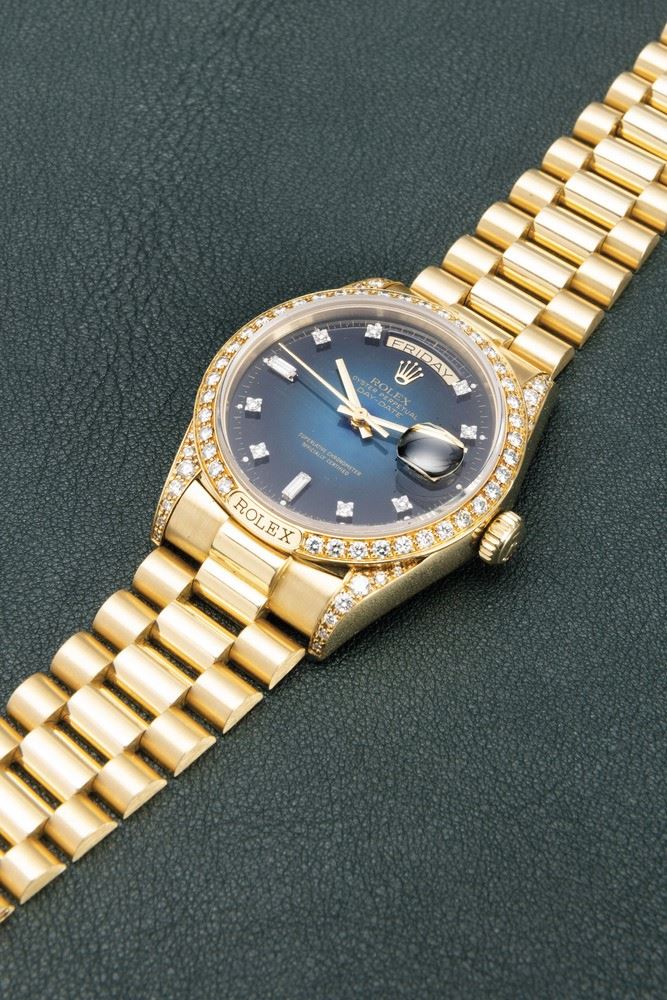 Since its first appearance in Basel in 1956, the Rolex Day-Date has always been automatic, water and shock resistant, with indications not only of hours, minutes and seconds, but also of day and date.