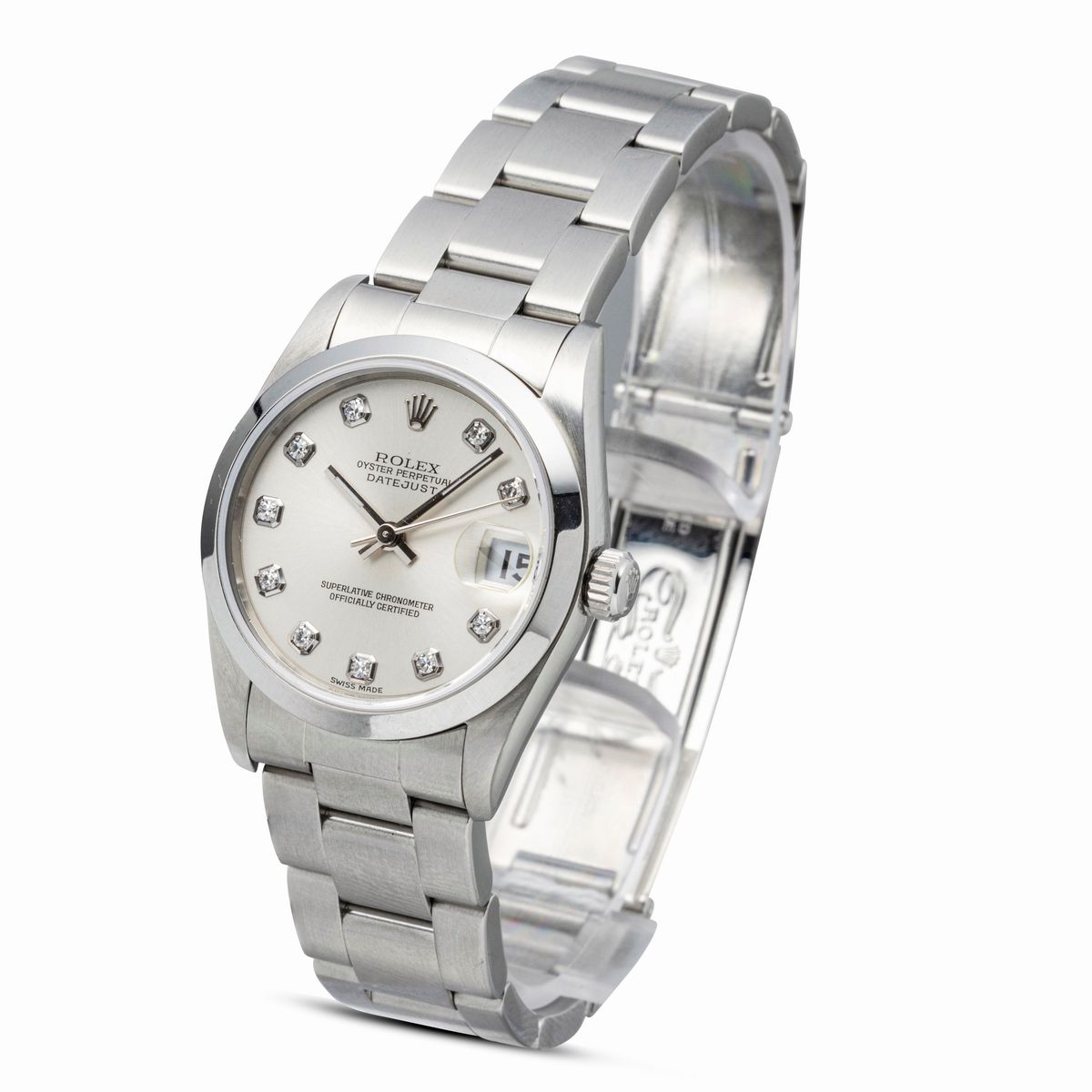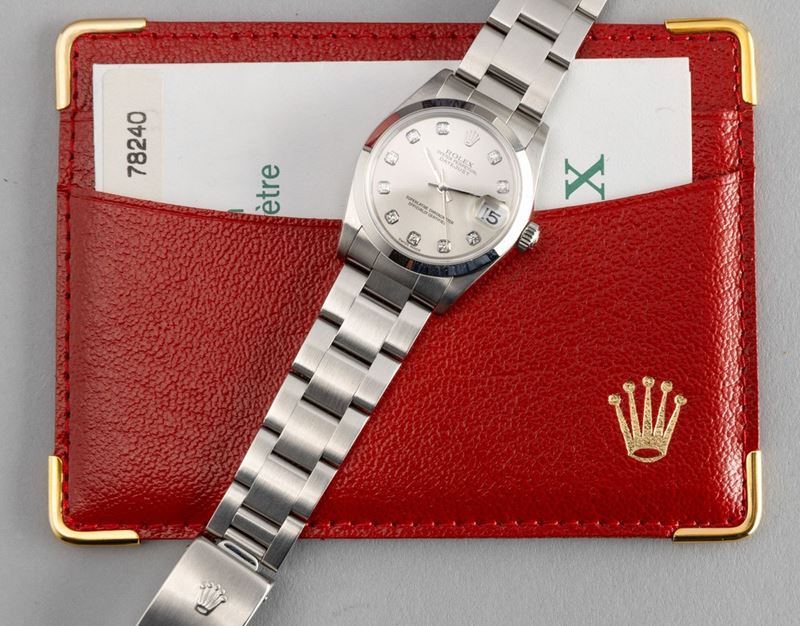 Fine and elegant stainless steel Datejust with smooth bezel, silver dial with hour markers in brilliant, medium size, accompanied [..]